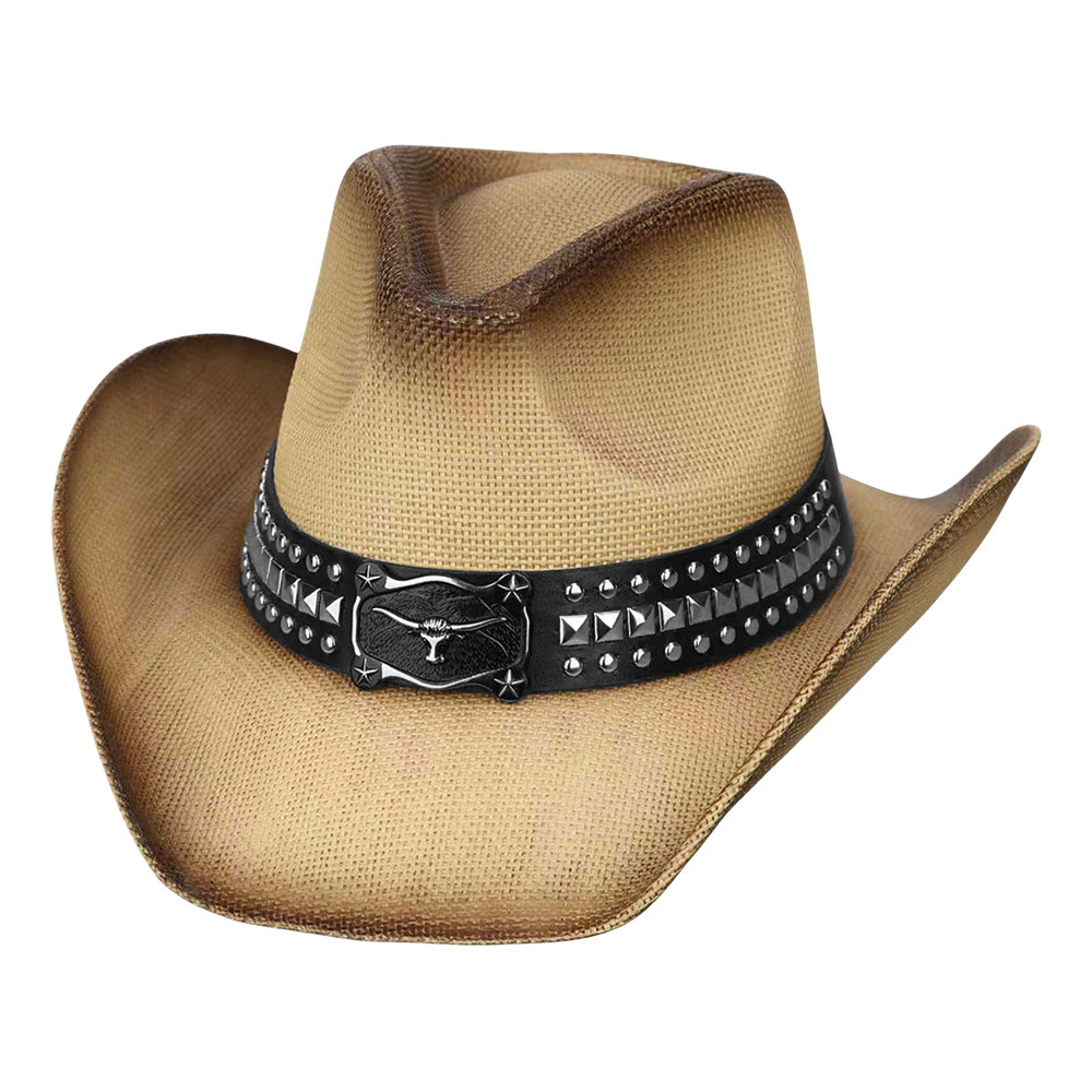 Metal Steer Head Buckle Studded Faux Leather Band Western Straw Cowboy Hat