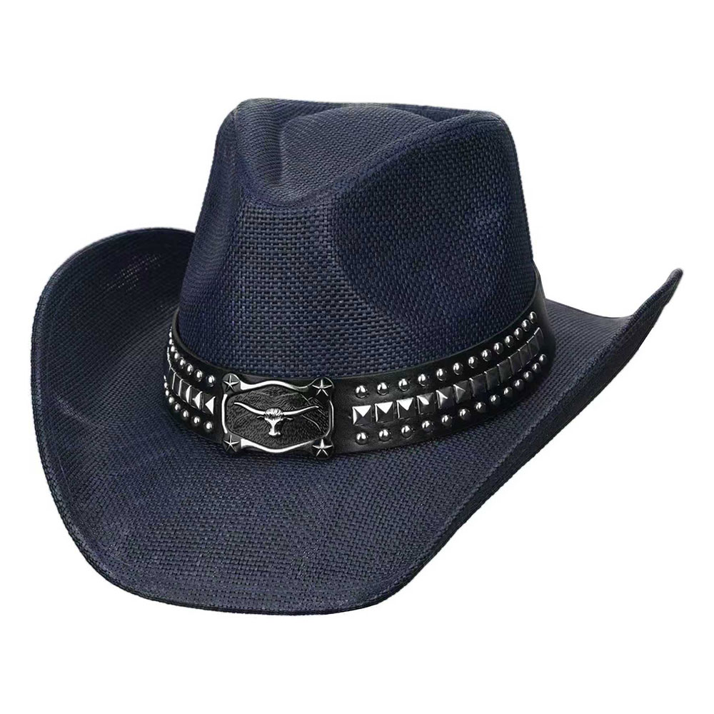 Metal Steer Head Buckle Studded Faux Leather Band Western Straw Cowboy Hat