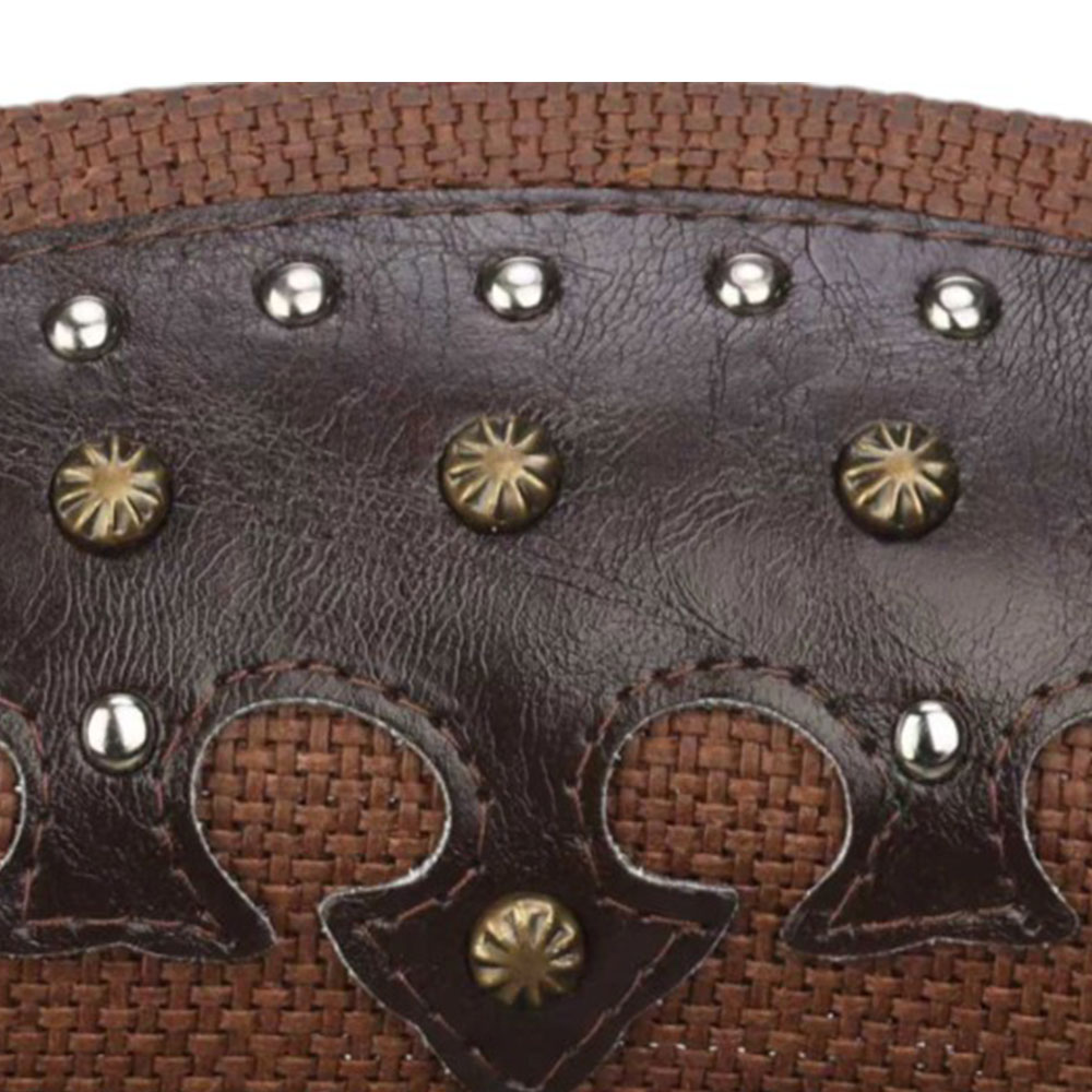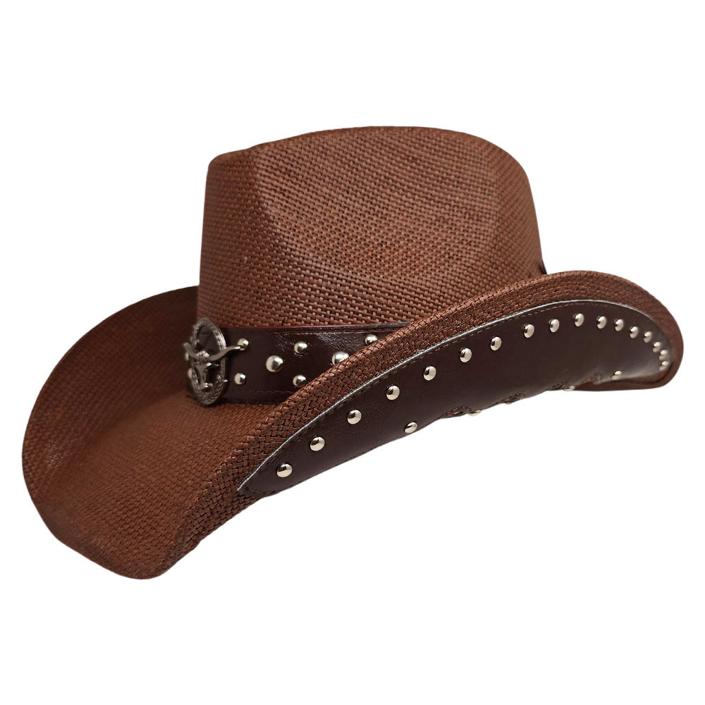 Metal Steer Head Emblem Studded Faux Leather Band Western Straw Cowboy Fedora Hat