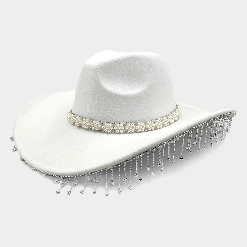 Pearl Flower Cluster Embellished Band Pointed Rhinestone Stone Paved Fringe Around Cowboy Western Hat