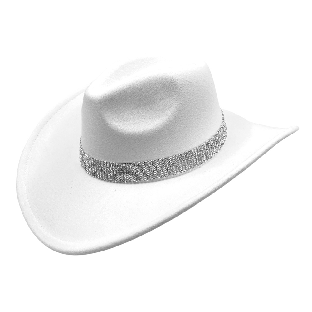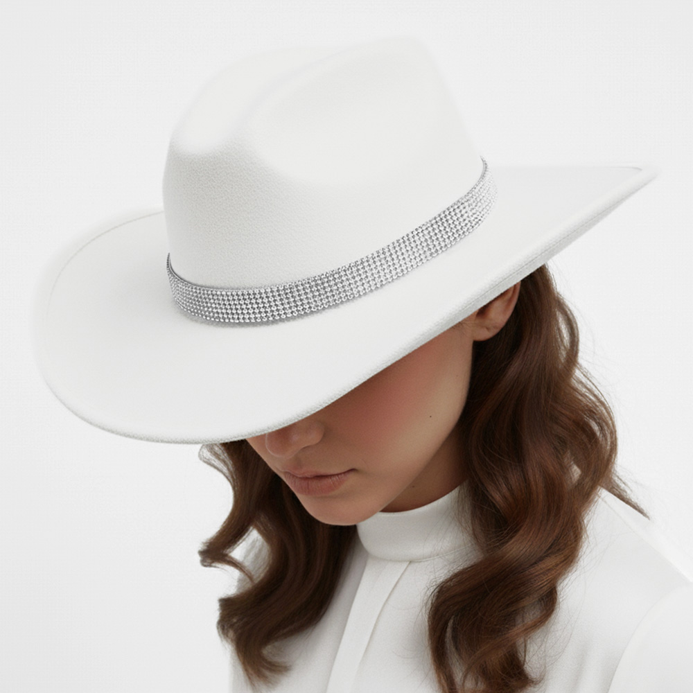 Details • Crown Circumference : 23" • Crown Height : 4.75" • Brim Height : 3.5" • Material : 100% Polyester • Make a striking impression with this wide-brim statement cowboy fedora hat featuring a glimmering crystal band. Designed for timeless elegance and modern sophistication, it adds a touch of glamour to any outfit—perfect for upscale events, travel, or fashionable daywear.