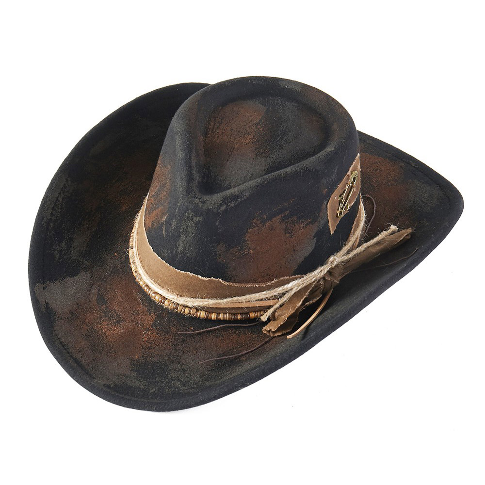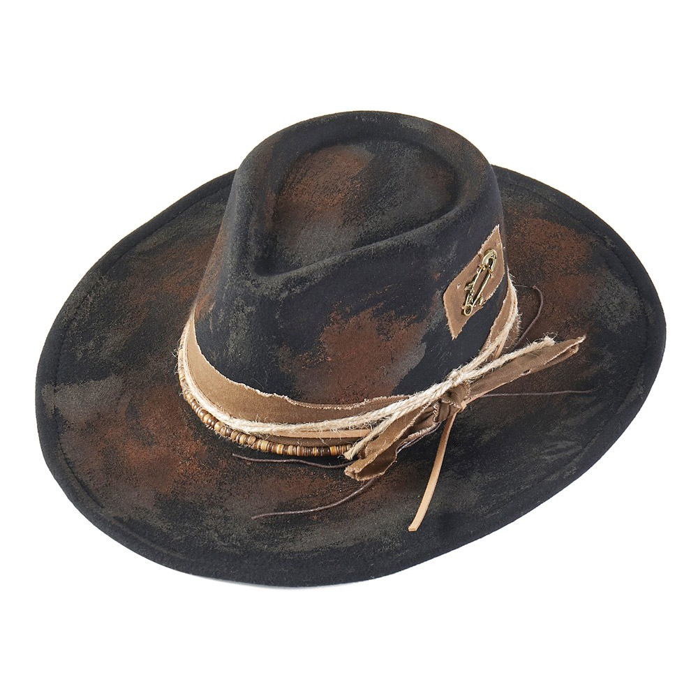 Details • Crown Circumference : 23" • Crown Height : 4.5" • Brim Height : 3.75" • Material : 100% Polyester • Make a statement with the Distressed Western Hat, featuring a rugged design and rustic band detail. Its weathered finish and handcrafted accents create an authentic vintage feel, perfect for outdoor adventures, festivals, or casual wear with timeless western-inspired charm.