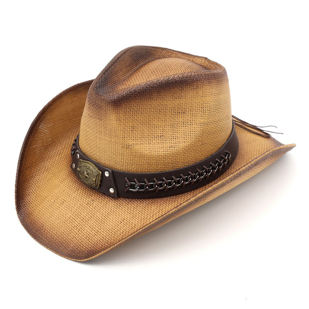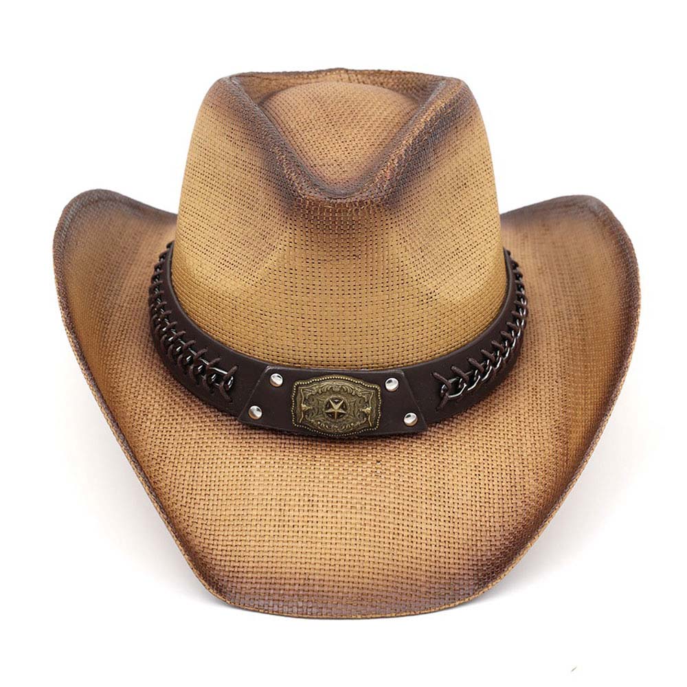 Rustic Star Concho Belt Accent Faux Leather Band Western Straw Cowboy Hat