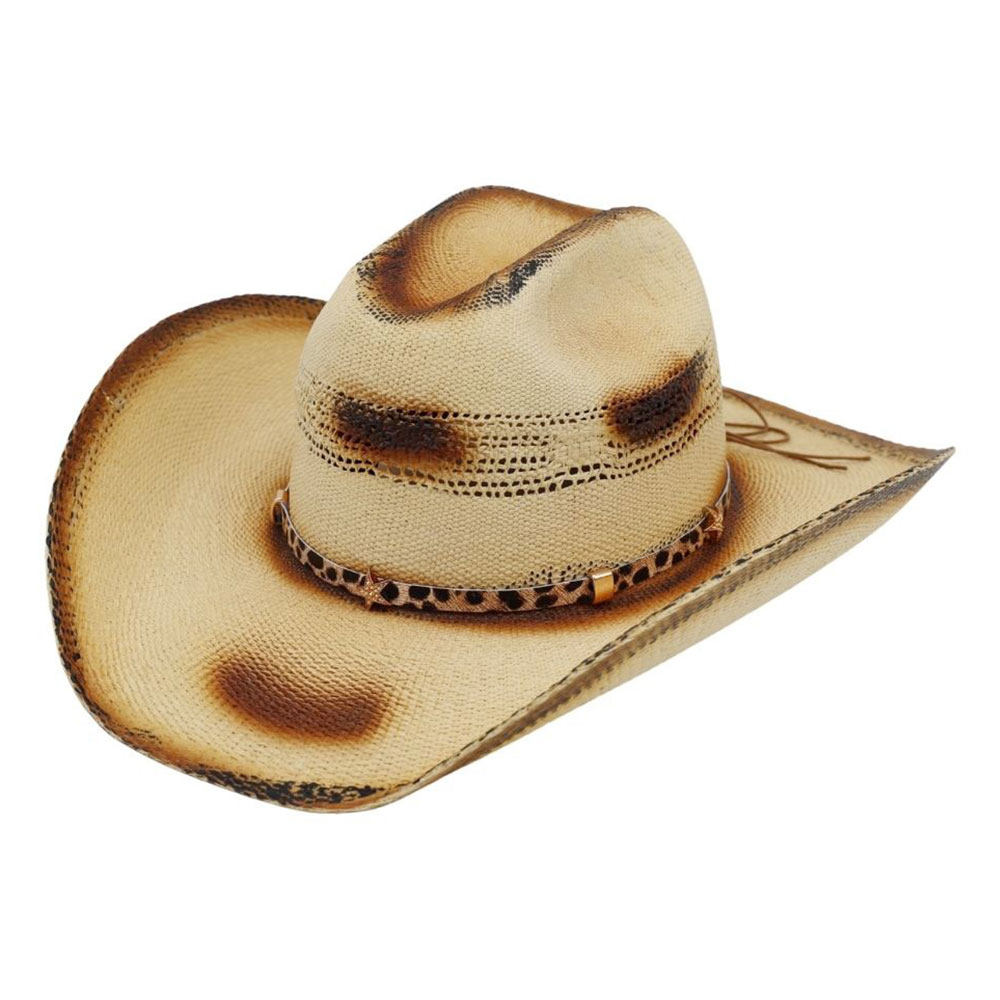 Star Accent Leopard Pattern Faux Leather Band Distressed Two Tone Western Straw Cowboy Hat