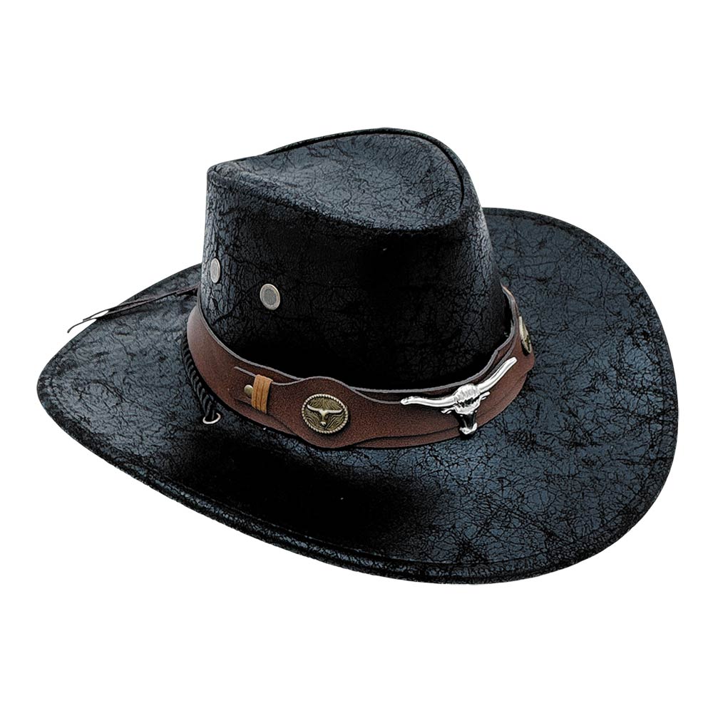 Details • Size : One Size • Material : 100% Polyester • Add rugged western flair with this cowboy hat featuring a structured crown, wide brim, and decorative band with bull skull accents. Ideal for rodeos, country concerts, festivals, themed events, or western-inspired styling, it delivers bold character and standout appeal for everyday or special occasions.