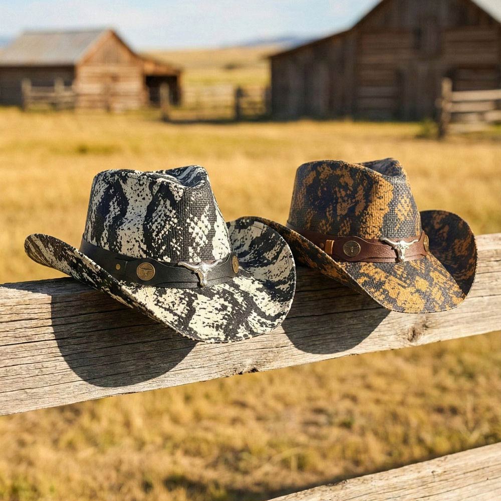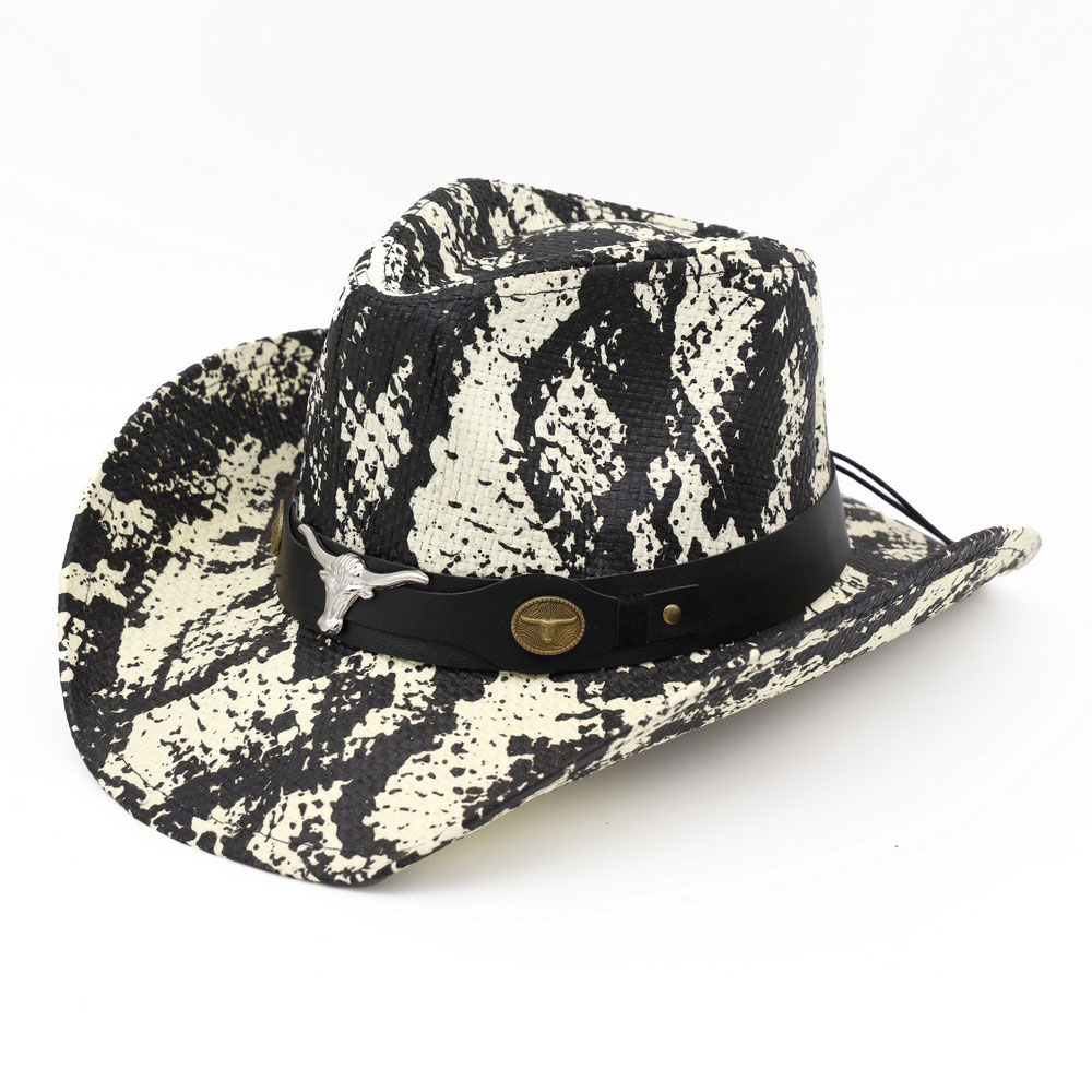 Details • Size : One Size • Material : 100% Paper • Classic western cowboy hat designed with a structured crown and curved brim, finished with a bold bull skull accent for a rugged, statement look. Ideal for western fashion, festivals, rodeo styling, and boutique collections seeking iconic cowboy appeal with modern attitude.