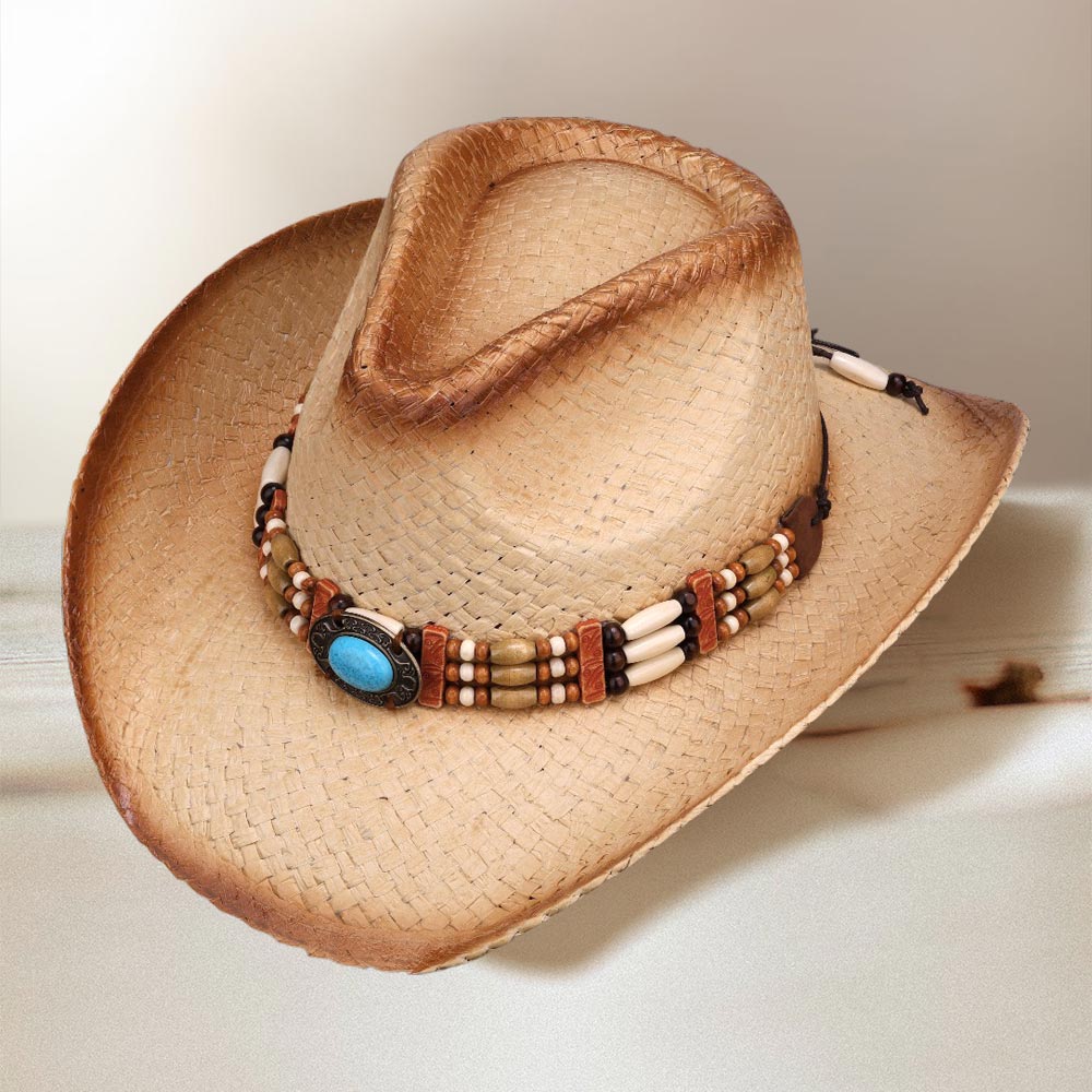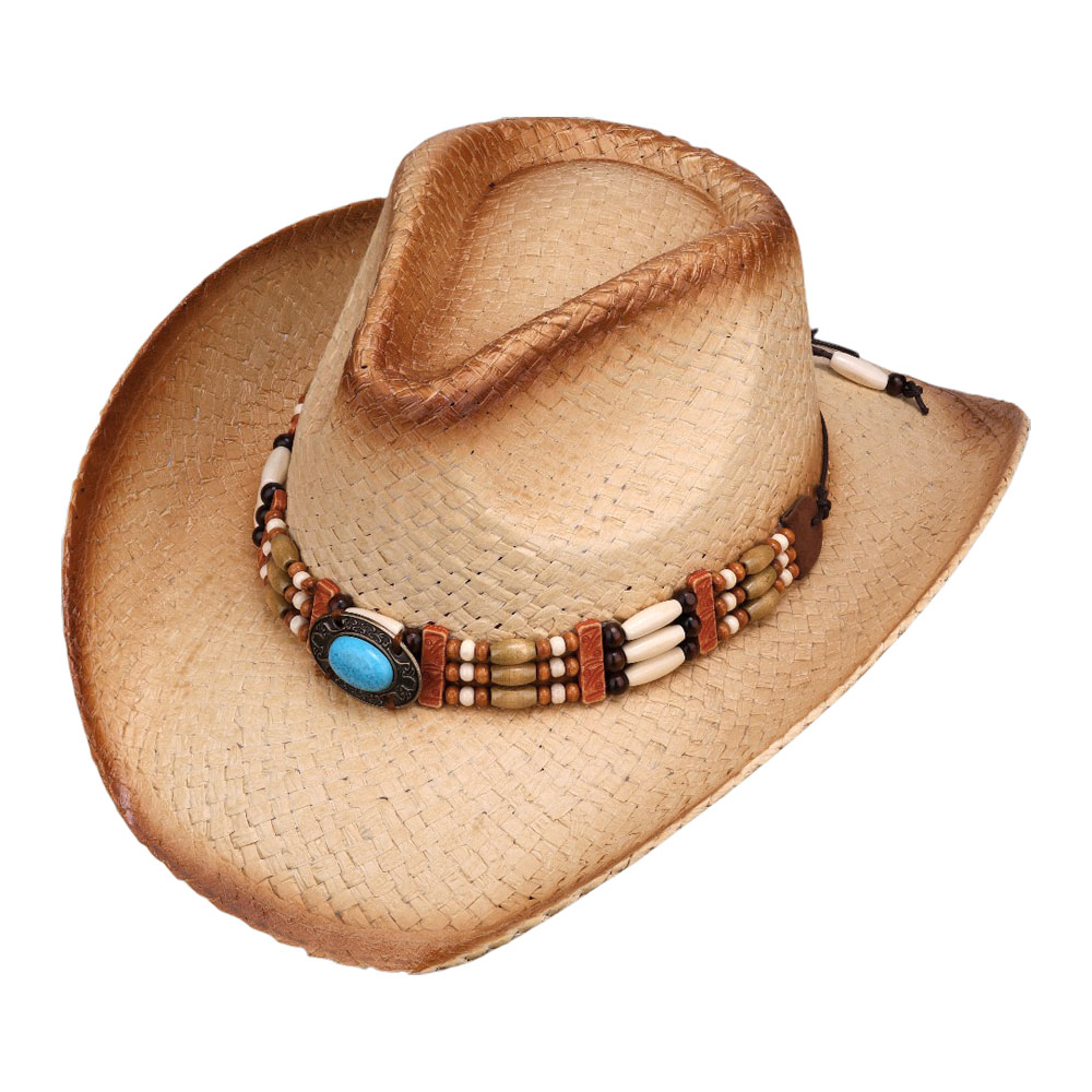 Turquoise Stone Pointed Wooden Beaded Band Western Straw Cowboy Fedora Hat