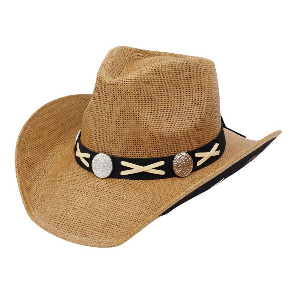 Details • Size : One Size • Material : 100% Paper • Classic western-inspired cowboy hat designed with a bold concho band accent that adds character and timeless appeal. Perfect for western boutiques, festivals, rodeos, and everyday styling, this statement hat delivers standout charm, versatility, and trend-driven flair for any accessory assortment.