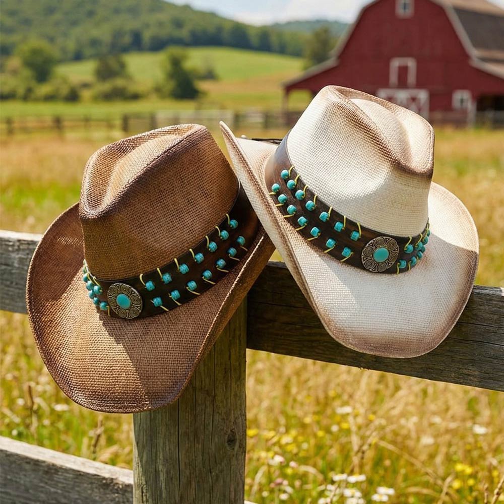 • Eye-catching western cowboy hat featuring a beaded concho accent band that adds bold character and charm. Designed with a structured crown and curved brim, this statement hat is perfect for festivals, rodeos, concerts, country events, themed outfits, and standout everyday western looks.