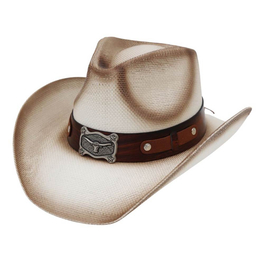 Details • Size : One Size • Material : 100% Paper • Classic western cowboy hat designed with a bold longhorn buckle accent band for a rugged, iconic look. Features a structured crown and curved brim that elevate rodeo outfits, country concerts, festivals, western-themed events, and everyday statement styling with timeless cowboy appeal.