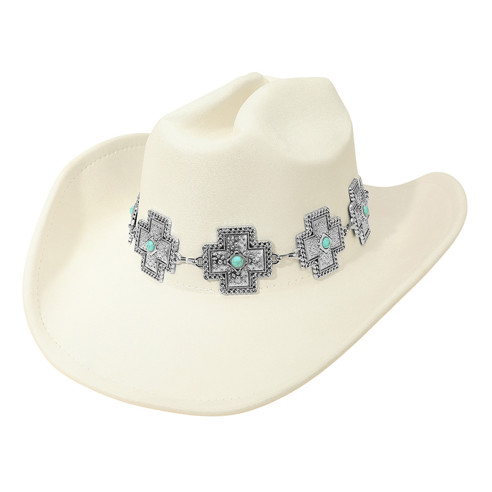 • Classic cowboy hat accented with a bold cross concho chain band featuring detailed engravings and turquoise-style accents. Perfect for rodeo events, concerts, festivals, and western wear, this hat blends traditional cowboy style with standout charm, making it a must-have western accessory.