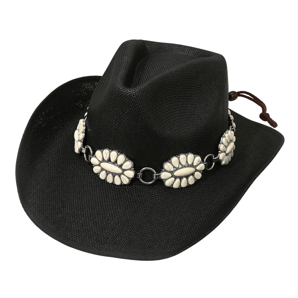 • Showcase bold western style with this cowboy hat featuring a linked concho band in a striking design. Perfect for festivals, concerts, or casual wear, it blends rugged tradition with sleek detail, making it a standout accessory for any modern cowboy look.