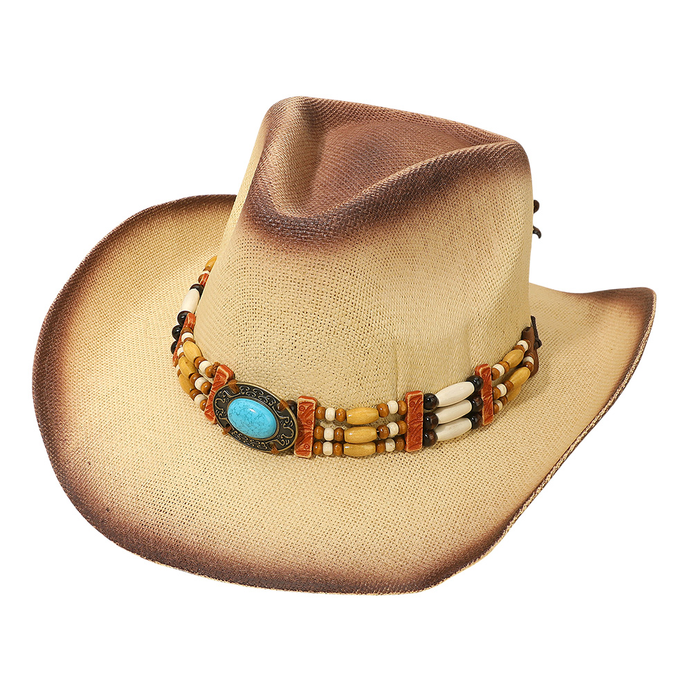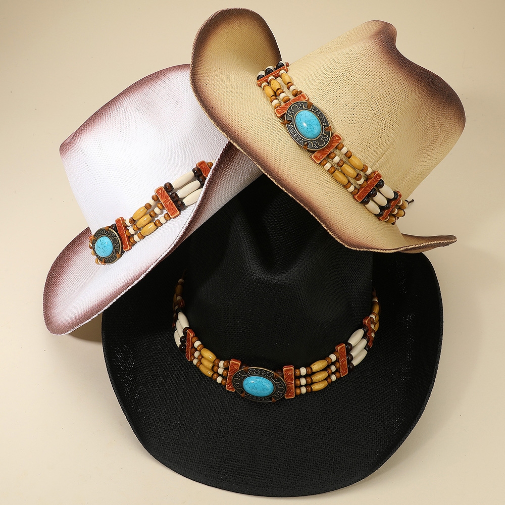 Western Oval Turquoise Concho Buckle Wooden Beaded Band Cowboy Fedora Hat
