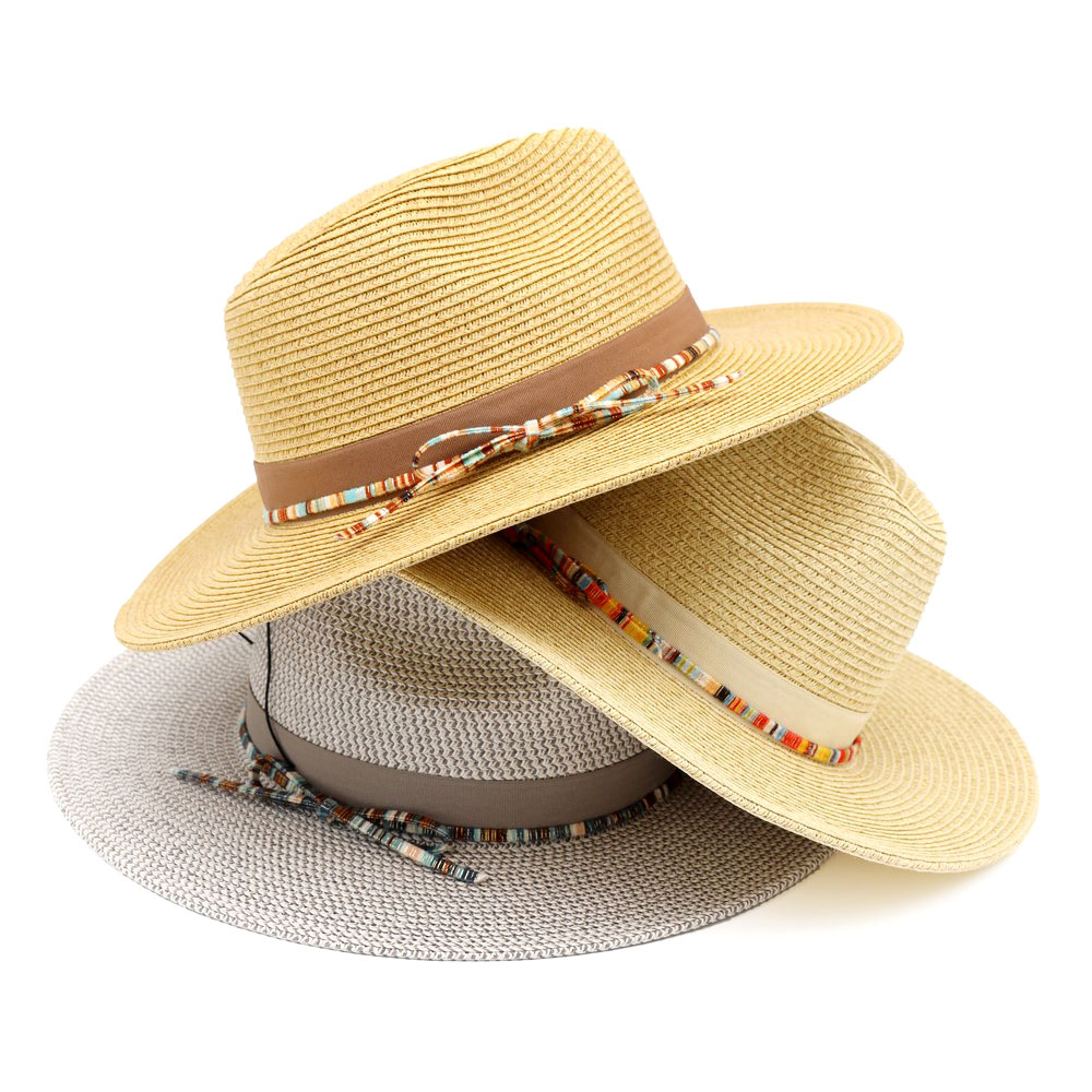 Details • Size : One Size • Material : 80% Paper, 20% Polyester • This wide brim woven fedora sun hat features a structured crown paired with a subtle decorative trim band for a refined, modern look. Designed for versatile styling, it transitions easily from casual outings to travel and resort wear. An easy-to-style accessory that adds polish to seasonal outfits while offering strong visual appeal for retail and boutique collections.