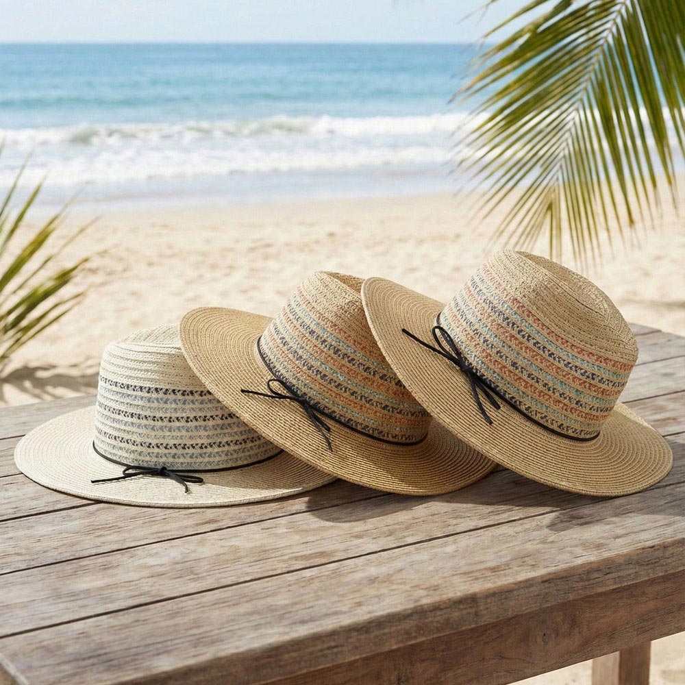 Details • Size : One Size • Material : 80% Paper, 20% Polyester • This wide brim woven sun hat features a structured crown with a decorative patterned band that adds visual interest without overpowering the design. Its balanced shape makes it ideal for everyday styling, travel, and resort wear. A versatile accessory that pairs easily with casual and seasonal outfits, offering strong retail appeal for boutiques seeking timeless yet eye-catching headwear.