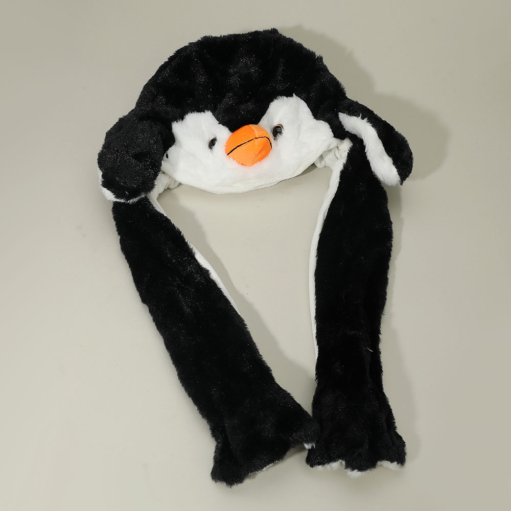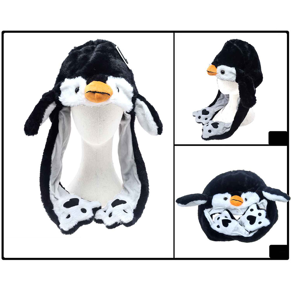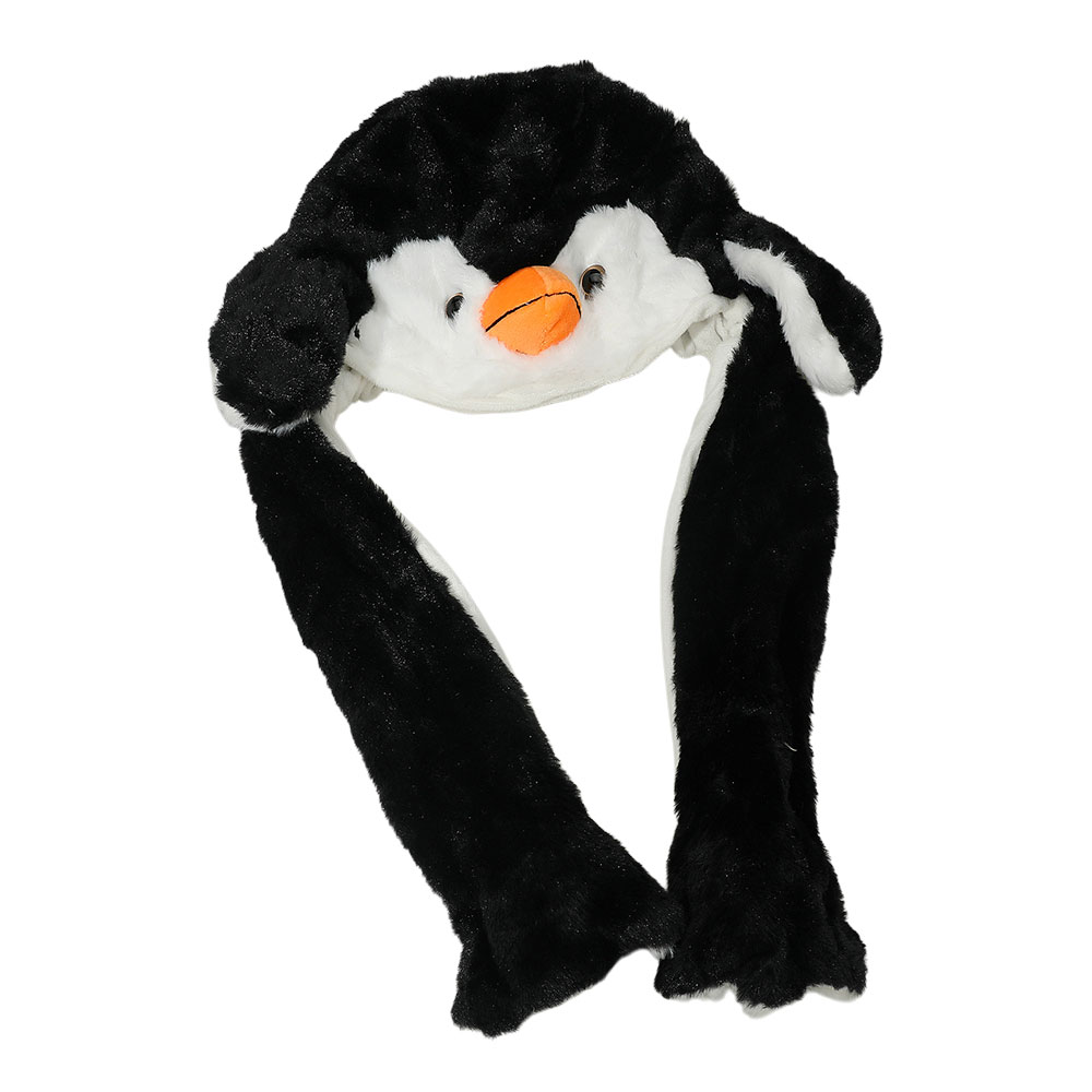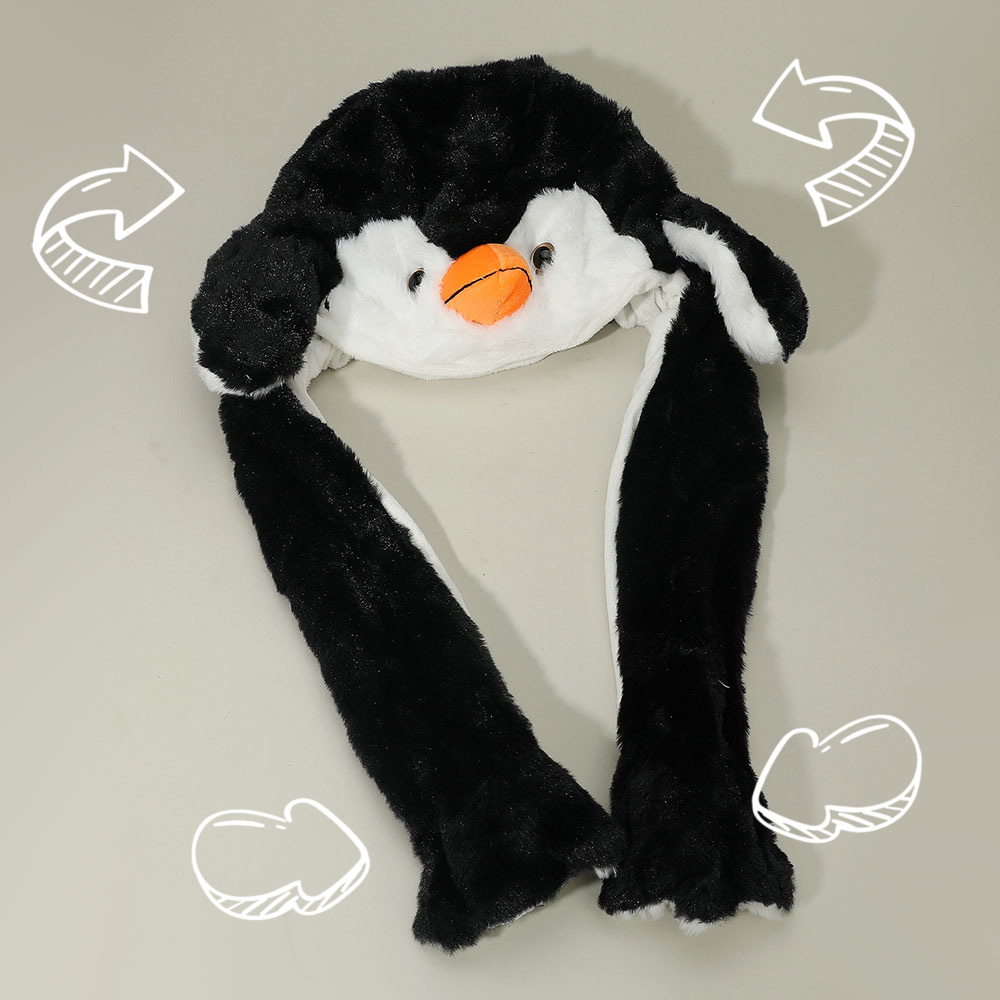 Details • Size : One Size (18" L) • Material : 100% Polyester • Bring joy and warmth to your style with this animated penguin hat featuring long flaps that move when you press the ends. Designed for fun, comfort, and cuteness, it’s ideal for cosplay, parties, or winter wear. A delightful accessory and playful gift for kids, teens, and adults.