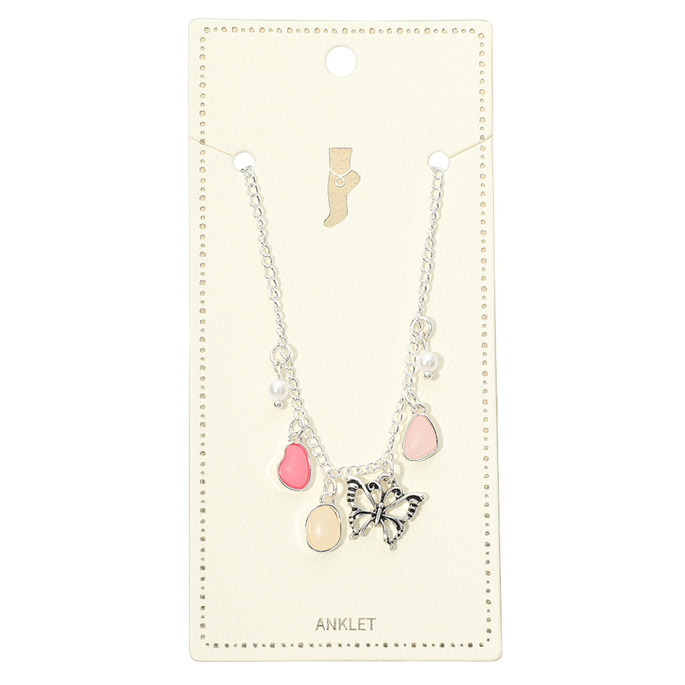Details • Size : 0.7" H, 9.25" + 1.75" L • Lobster Clasp Closure • Butterfly charm anklet featuring delicate dangling accents and a graceful winged design that symbolizes freedom and joy. Designed to add subtle movement and a playful touch to ankle styling for everyday wear or vacations. Ideal for gifting or boutique collections inspired by nature and feminine fashion. • Lead and Nickel Compliant