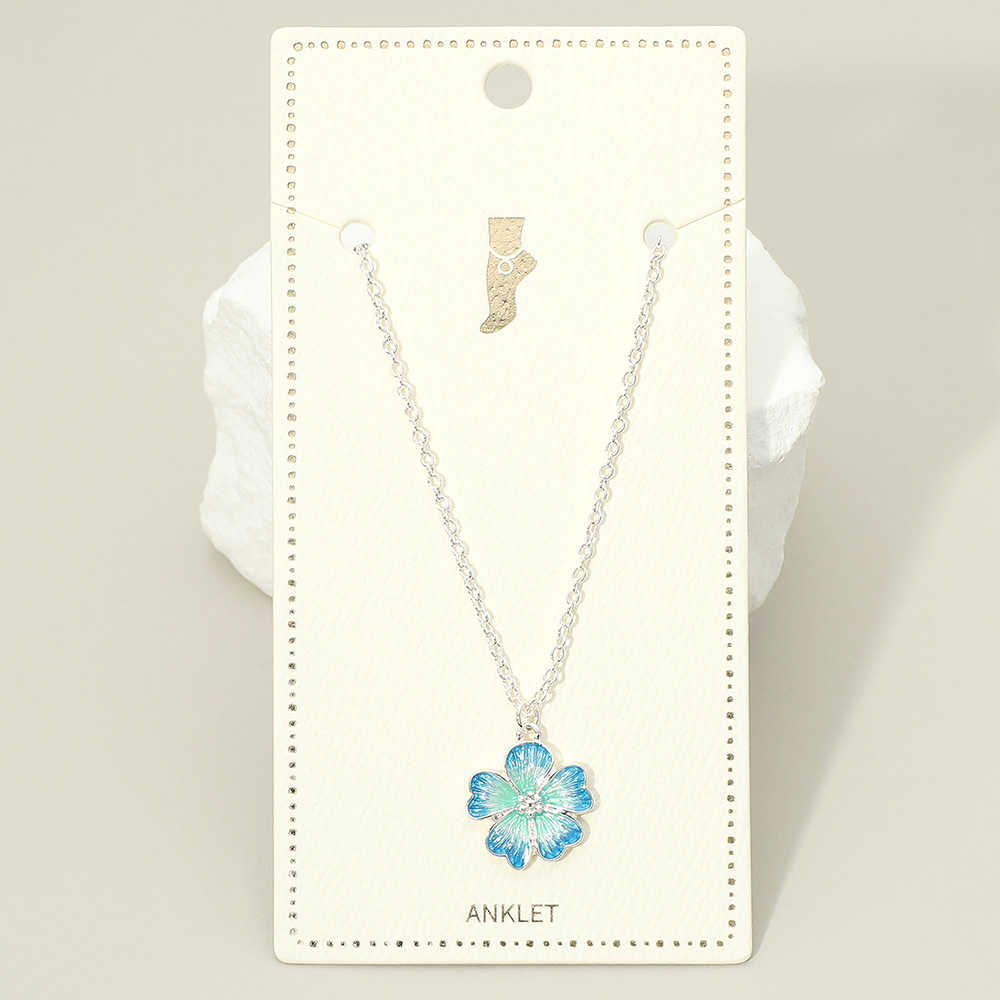 Details • Size : 9" + 1.5" L • Charm Size : 0.6" X 0.75" • Lobster Clasp Closure • Flower charm anklet featuring a soft nature-inspired floral design that adds feminine charm and gentle movement to ankle styling. Perfect for spring and summer collections, casual outfits, beachwear, and giftable assortments, this anklet appeals to customers seeking elegant, lightweight fashion jewelry with a fresh and timeless botanical feel. • Lead and Nickel Compliant