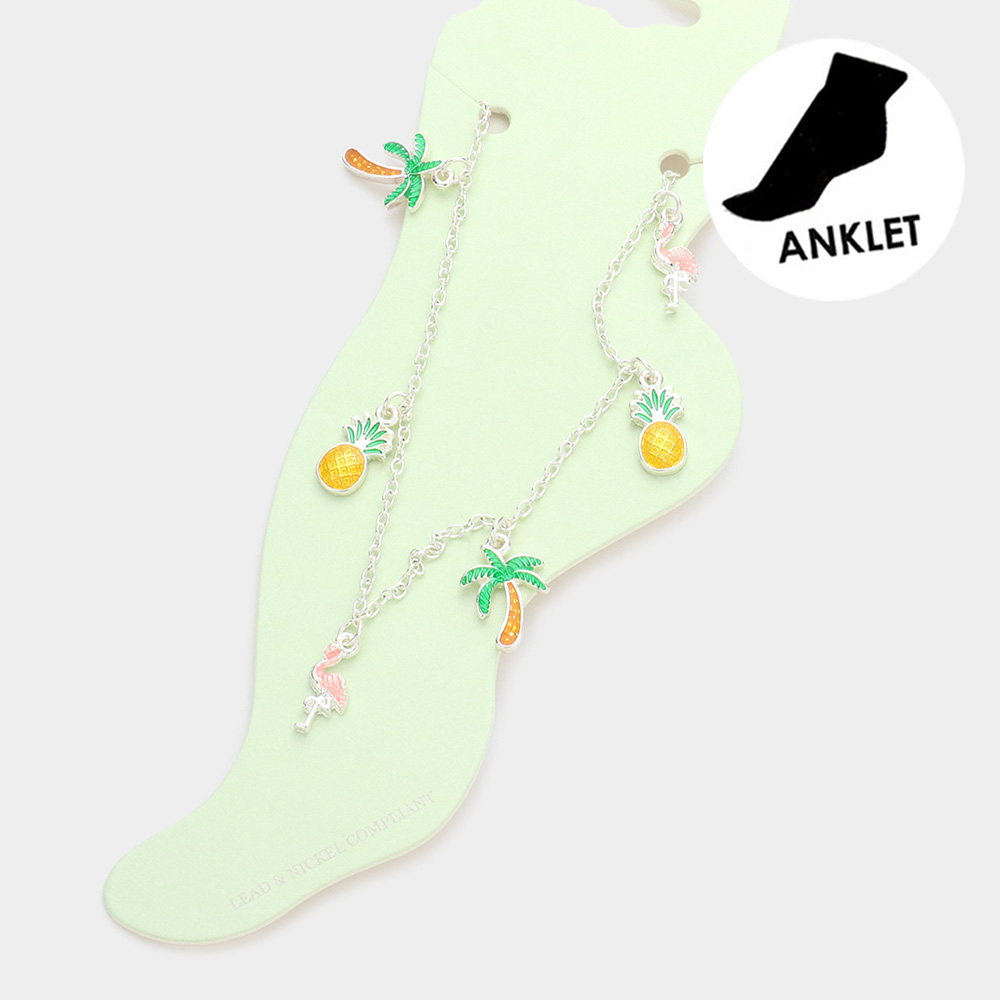 Enamel Palm Tree Pineapple Flamingo Charm Station Anklet