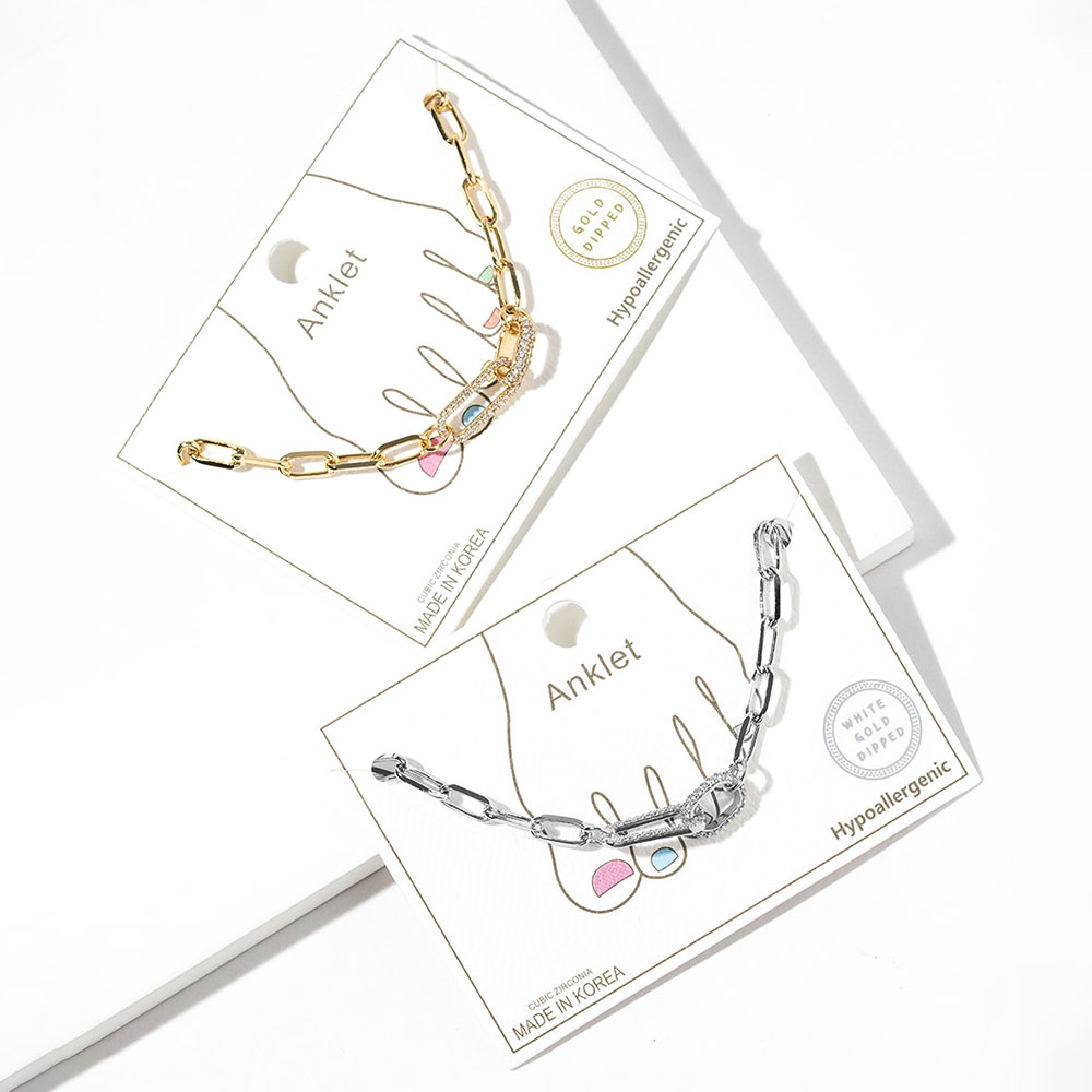 Details • Size : 0.3" H, 9" + 2" L • Lobster Clasp Closure • This stylish anklet features a modern paperclip chain design with a sparkling cubic zirconia-accented charm for added shine. Hypoallergenic and gold-dipped for lasting wear, it brings a chic, minimalist touch to summer outfits. Perfect for everyday elegance or layered looks. • Lead and Nickel Compliant • Hypoallergenic • Made In Korea • Gold Dipped • CZ Cubic Zirconia