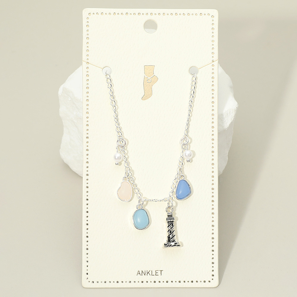 Details • Size : 0.75" H, 9.25" + 1.75" L • Lobster Clasp Closure • Lighthouse charm anklet featuring delicate dangling accents and a coastal-inspired design that symbolizes guidance and seaside charm. Designed to add subtle movement and character to ankle styling for everyday wear or vacation looks. Ideal for gifting or boutique collections focused on beach, ocean, and nautical-themed fashion jewelry. • Lead and Nickel Compliant