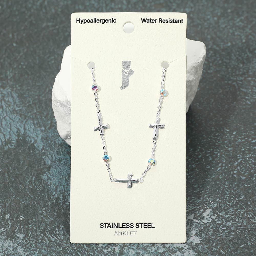 Details • Size : 0.3" H, 9.25" + 1.5" L • Lobster Clasp Closure • Water Resistant • Elegant chain anklet accented with cross charms and subtle crystal details for a meaningful yet stylish look. Designed for everyday wear, this anklet offers a lightweight feel and refined shine, making it perfect for casual outfits, special occasions, or layered jewelry styling. • Hypoallergenic • Stainless Steel