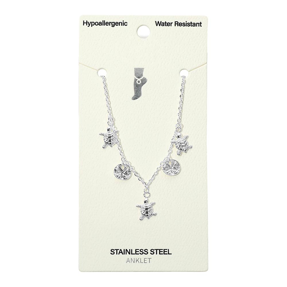 Details • Size : 9" + 1.5" L • Charm Size : 0.7" L • Lobster Clasp Closure • Water Resistant • Charming anklet designed with turtle sand dollar charms and coin accents for a playful coastal-inspired look. Lightweight and comfortable for everyday wear, this anklet adds personality to casual outfits, vacation styling, or layered jewelry looks with a fun and meaningful touch. • Hypoallergenic • Stainless Steel