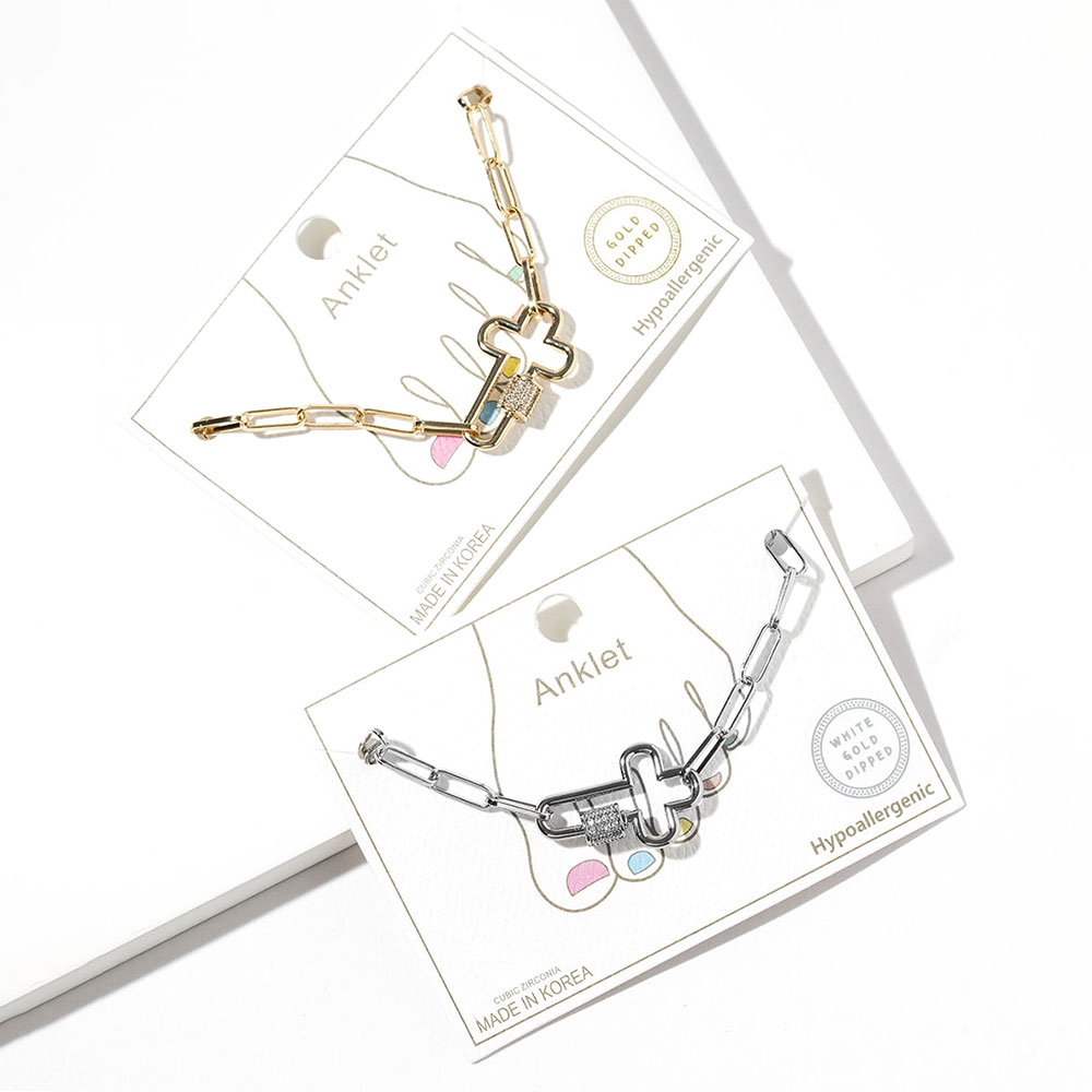Details • Size : 0.7" H, 8.5" + 2.5" L • Lobster Clasp Closure • Elegant cross charm anklet featuring a modern link chain design accented with sparkling cz stone details. This ankle bracelet adds a refined yet playful touch to everyday and dressy looks, making it perfect for layering or wearing solo. A versatile accessory ideal for boutiques, seasonal styling, and trend-forward collections. • Made In Korea • Gold Dipped • CZ Cubic Zirconia
