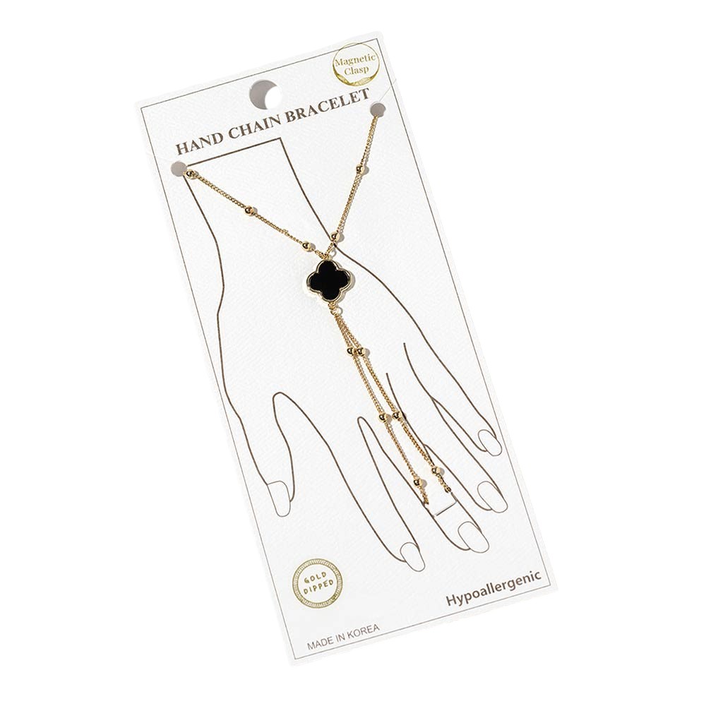 Details • Size : 0.8" H, 7" + 0.25" L • Ring Size : Free • Magnetic Clasp Closure • This stylish hand chain bracelet features a refined clover quatrefoil creates an elegant layered look. Finished with an easy magnetic clasp for comfortable wear, it adds a chic statement to everyday outfits, special occasions, and curated boutique jewelry collections. Designed to stand out while remaining versatile and wearable. • Gold Dipped • Hypoallergenic • Lead and Nickel Compliant • Made In Korea