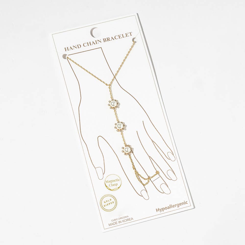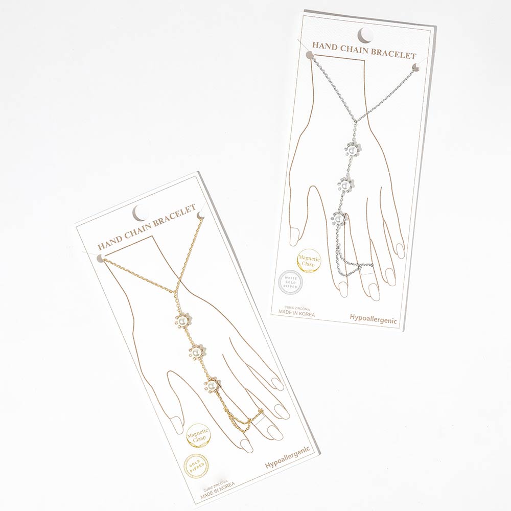 Details • Size : 3.5" H, 7" + 0.25" L • Ring Size : Free • Magnetic Clasp Closure • This floral hand chain bracelet features a delicate wrist-to-finger design accented with evenly spaced flower motifs for a soft, feminine look. Designed with a magnetic clasp for easy wear and secure fit, it offers elegant drape and comfortable movement. A versatile accessory ideal for boutique collections, layering displays, gifting assortments, and trend-driven jewelry styling. • CZ Cubic Zirconia • Gold Dipped • Hypoallergenic • Lead and Nickel Compliant • Made In Korea