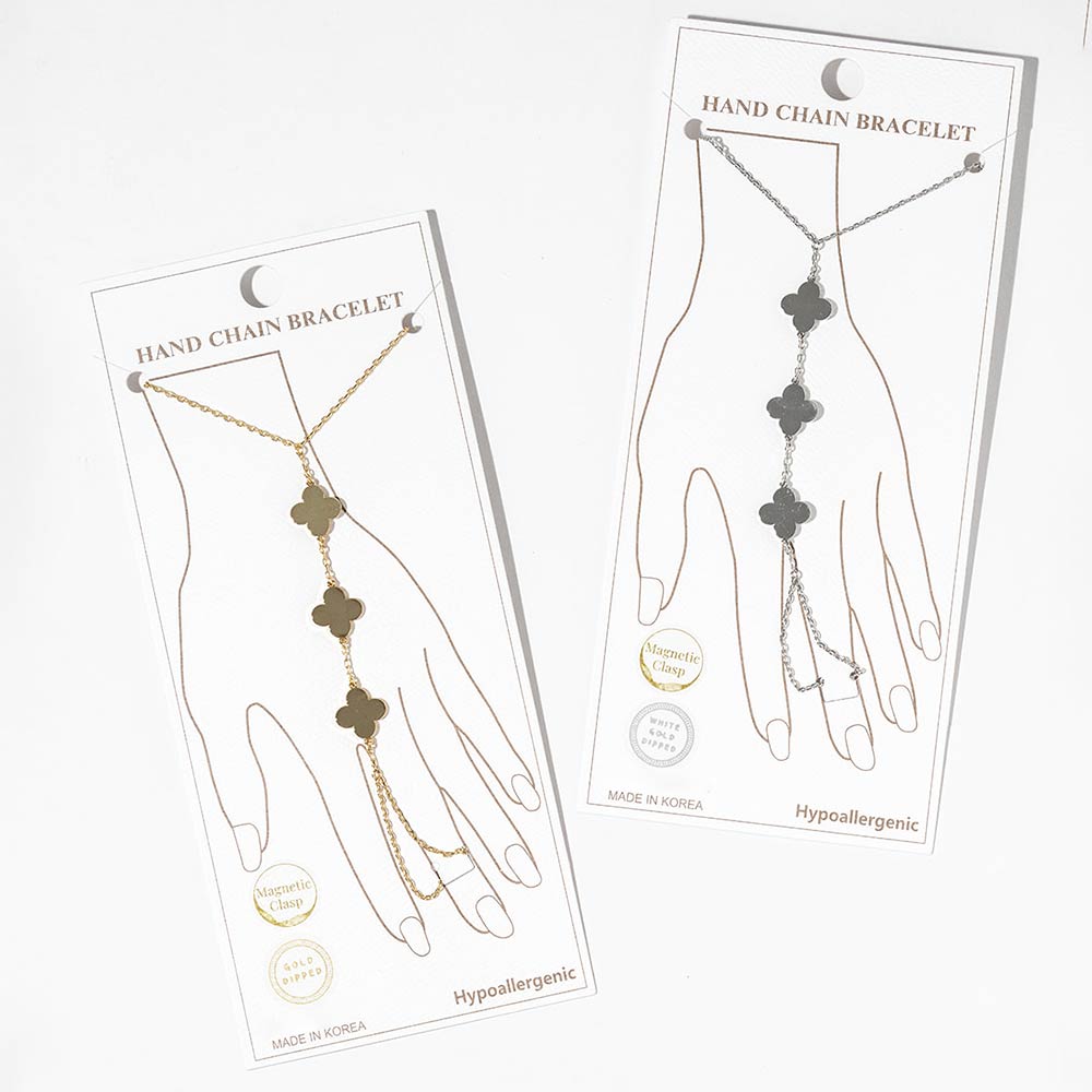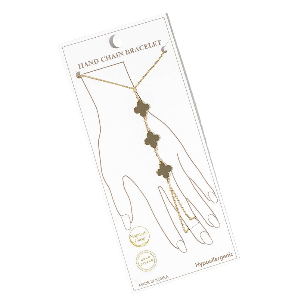Details • Size : 3.2" H, 7" + 0.25" L • Ring Size : Free • Magnetic Clasp Closure • This quatrefoil hand chain bracelet features a refined wrist-to-finger silhouette accented with multiple quatrefoil charms for a balanced, elegant look. Designed with a magnetic clasp for easy wear and secure fit, it offers graceful drape and everyday versatility. Ideal for boutique jewelry collections, layering styles, gifting displays, and trend-forward accessory assortments. • Gold Dipped • Hypoallergenic • Lead and Nickel Compliant • Made In Korea