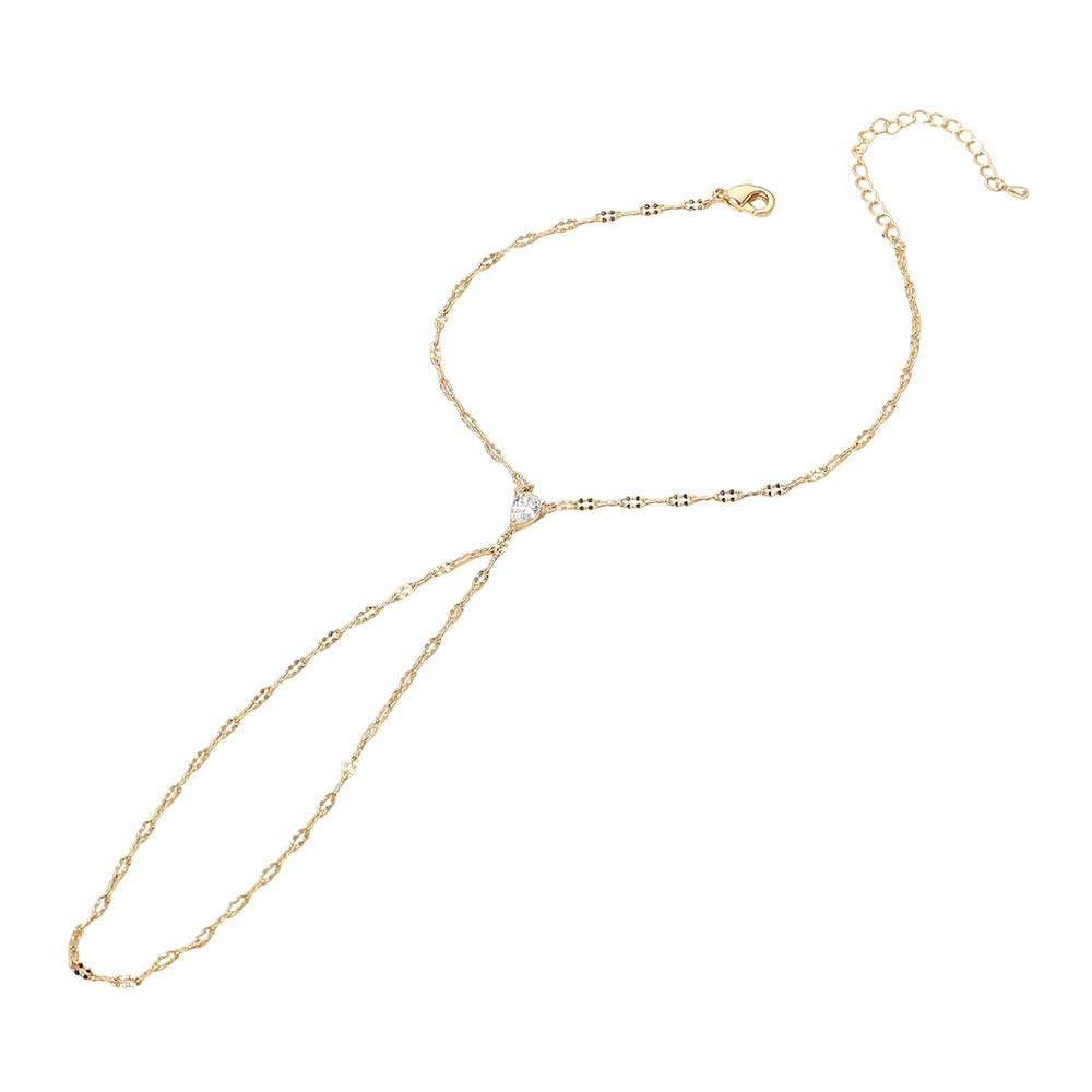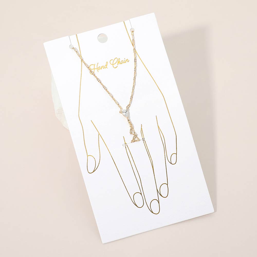 Details • Size : 4" H, 7.5" + 2.25" L • Ring Size : Free • Elegant hand chain bracelet designed with a delicate wrist chain and connected finger loop for a refined silhouette. Features a subtle accent detail that adds gentle shine without overpowering. Ideal for boutique collections, gifting, or everyday styling, this lightweight piece layers beautifully and offers a modern, graceful jewelry look. • Made In Korea