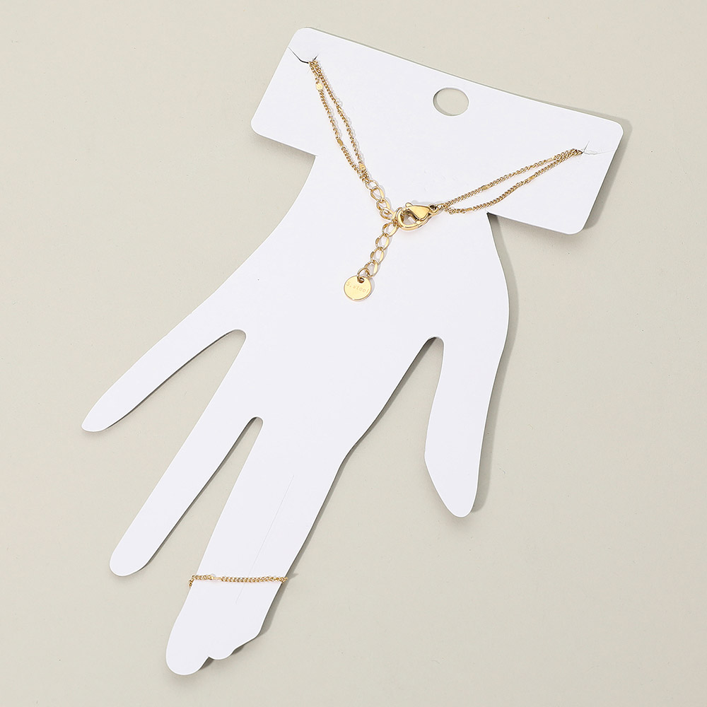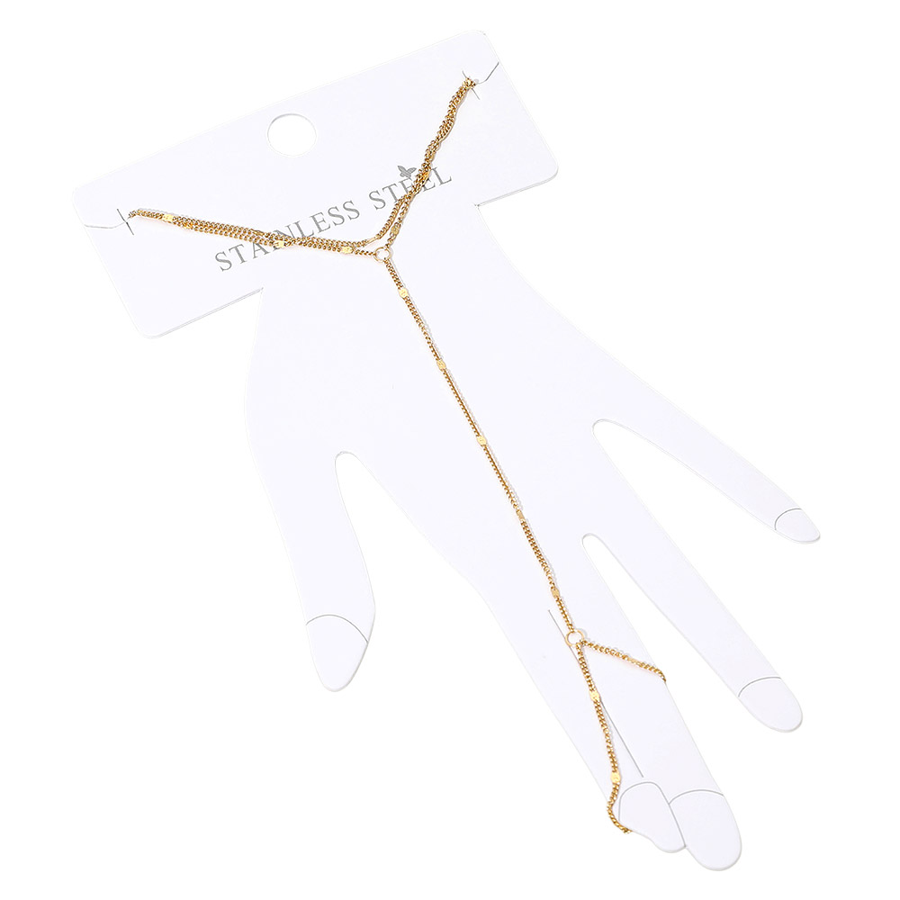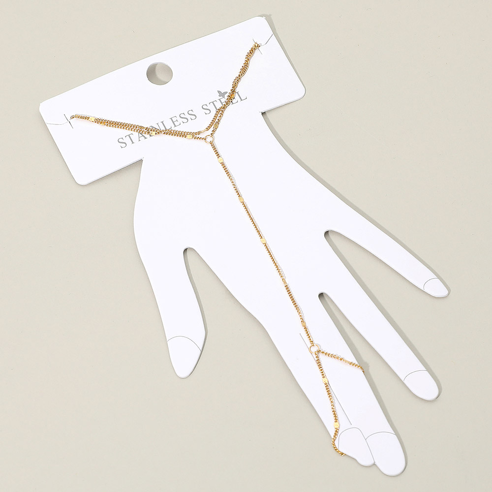 Details • Size : 3.25" H, 6.5" + 1" L • Ring Size : Free • Elegant minimalist hand chain bracelet featuring a fine linked chain with a ring connector that drapes beautifully across the hand. Lightweight, refined, and perfect for everyday wear or special occasions, adding a subtle touch of modern elegance to any look. • Stainless Steel