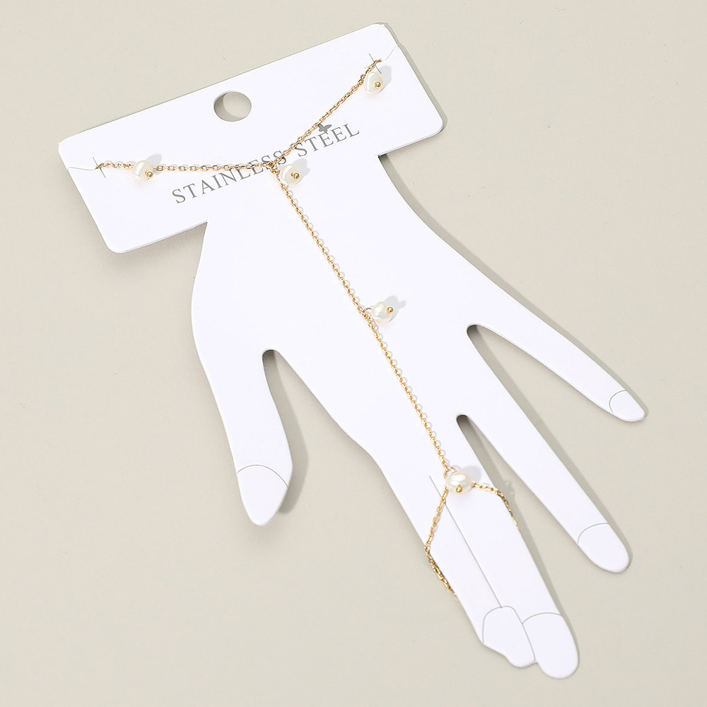 • Delicate hand chain bracelet featuring a slim linked design with subtle pearl bead accents and a graceful ring-to-wrist connection. Adds a refined touch to casual or dressy looks, offering lightweight comfort and stylish detail suitable for everyday wear or special occasions.
