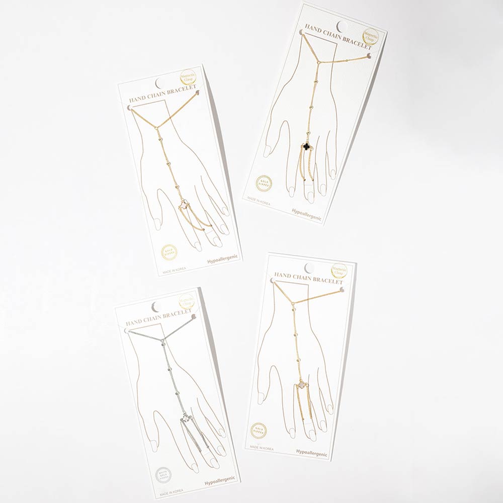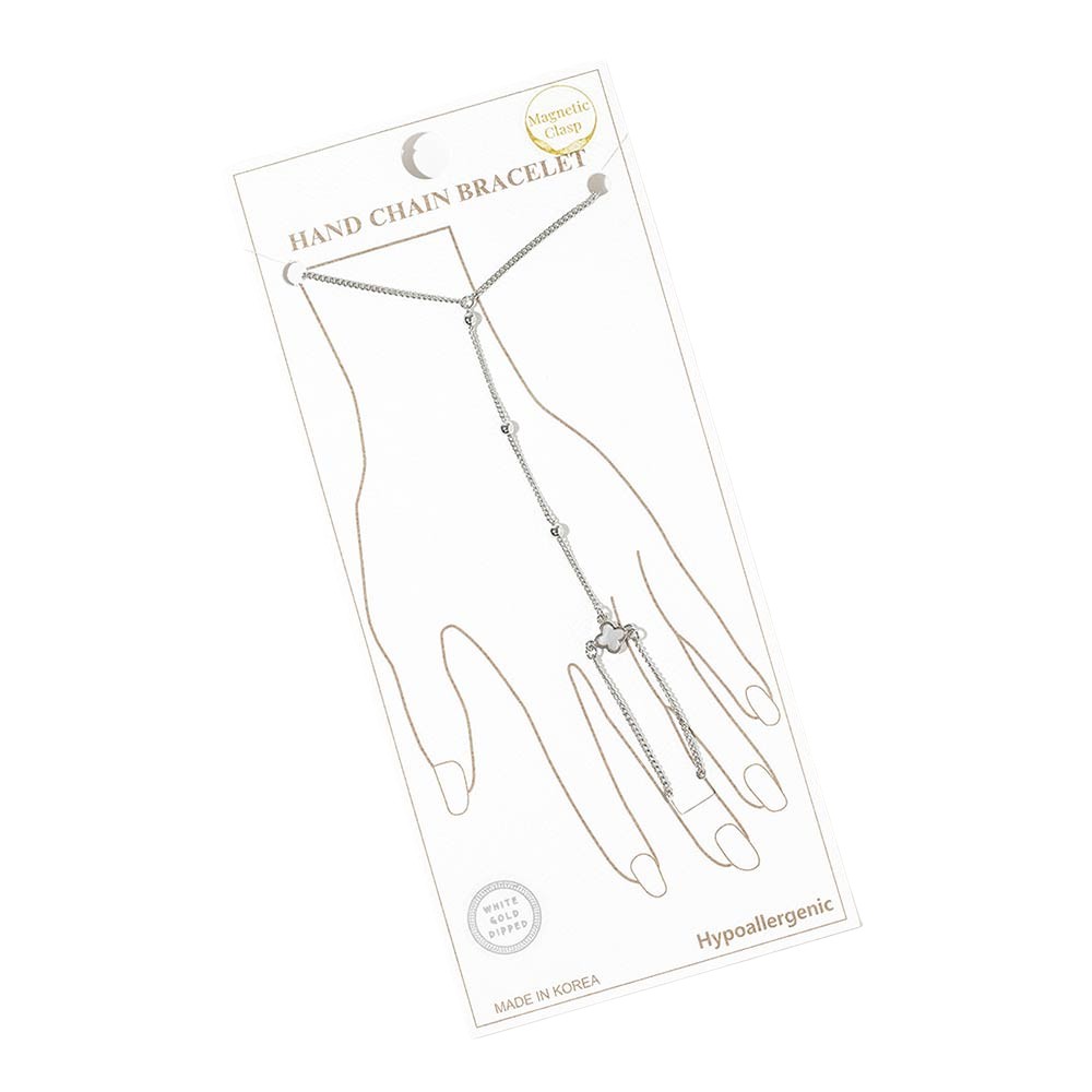 Details • Size : 3" H, 7" + 0.25" L • Ring Size : Free • Magnetic Clasp Closure • This stylish hand chain bracelet features a sleek connected design that links wrist and finger for a modern, fashion-forward look. Designed with an easy magnetic clasp for quick wear, it offers a delicate statement ideal for everyday outfits, special occasions, and trend-driven boutique collections. Perfect for customers seeking unique, minimalist hand jewelry with effortless elegance. • Lead and Nickel Compliant • Hypoallergenic • Made In Korea • Gold Dipped