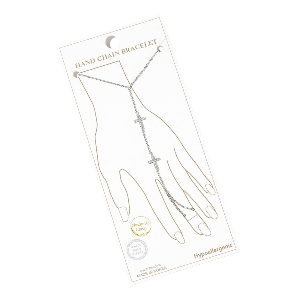 Details • Size : 3.25" H, 7" + 0.25" L • Ring Size : Free • Magnetic Clasp Closure • This elegant hand chain bracelet features a refined cross accent with a connected wrist-to-finger design for a modern, graceful statement. Designed with a convenient magnetic clasp for easy wear, it delivers a sleek layered look that elevates everyday outfits, evening styles, and boutique jewelry collections. Ideal for customers seeking meaningful yet fashion-forward hand jewelry. • CZ Cubic Zirconia • Gold Dipped • Hypoallergenic • Lead and Nickel Compliant • Made In Korea