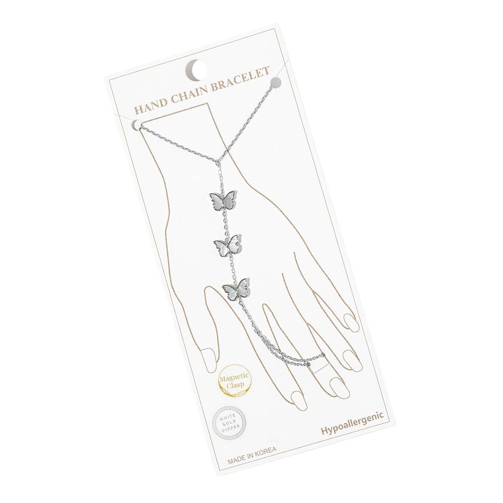 Details • Size : 3" H, 7" + 0.25" L • Ring Size : Free • Magnetic Clasp Closure • This butterfly hand chain bracelet features a delicate wrist-to-finger design accented with butterfly charms for a graceful, eye-catching look. Designed with a magnetic clasp for easy wear, it offers elegant movement and statement appeal. Ideal for boutique jewelry collections, layering styles, and everyday or special occasion accessorizing. • Gold Dipped • Hypoallergenic • Lead and Nickel Compliant • Made In Korea