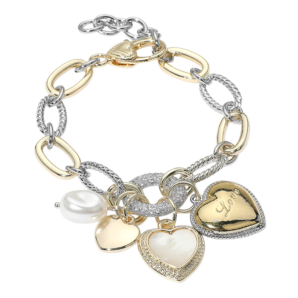 Details • Size : 1.8" H, 8" + 1.5" L • Lobster Clasp Closure • Statement bracelet featuring mixed link design and layered heart charms, including engraved and crystal-accented details. A romantic accessory perfect for gifting or adding charm to your everyday style. • CZ Cubic Zirconia • Gold Dipped