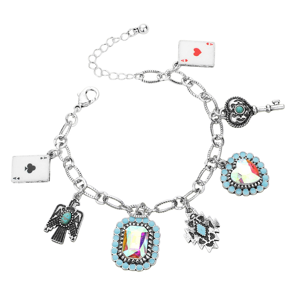 Ace Of Heart Ace Of Clover Western Bird Key Rectangle Heart Stone Cluster Charm Station Bracelet
