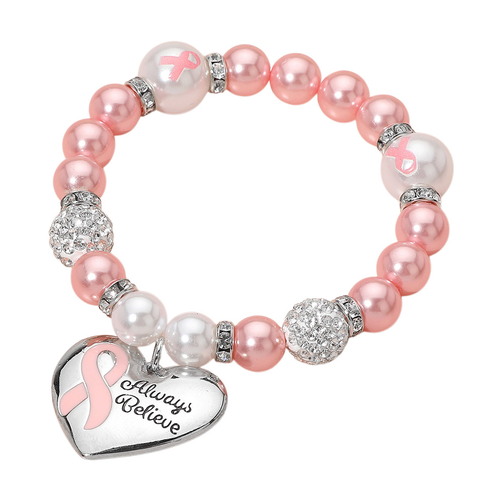 ALWAYS BELIEVE Pink Ribbon Heart Charm Pearl Shamballa Ball Beaded Stretch Bracelet ALWAYS BELIEVE Pink Ribbon Heart Charm Pearl Shamballa Ball Beaded Stretch Bracelet