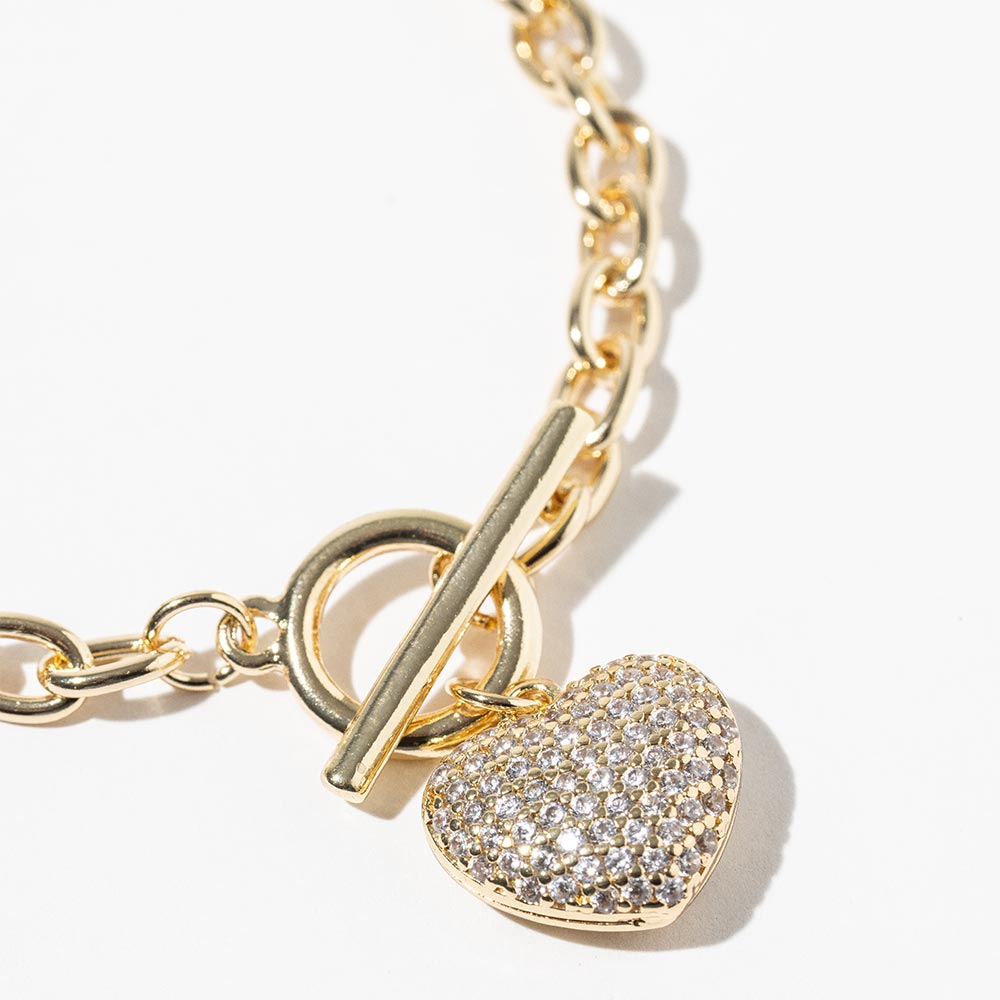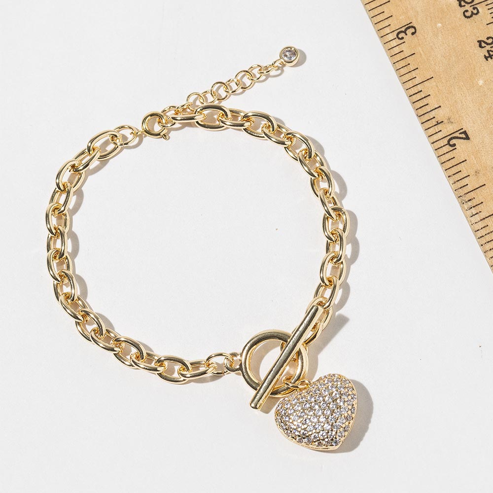 Details • Size : 0.25" H, 7" + 1" L • Charm Size : 0.7" X 0.6" • Lobster Clasp Closure • A chic link bracelet featuring a shimmering heart charm adorned with cubic zirconia for added radiance. This elegant toggle-chain design offers a polished, stylish finish perfect for dressing up any look or adding everyday glamour. Ideal for layered styling or as a statement piece, it delivers classic charm with a modern twist. • Lead and Nickel Compliant • Made In Korea • Gold Dipped • CZ Cubic Zirconia