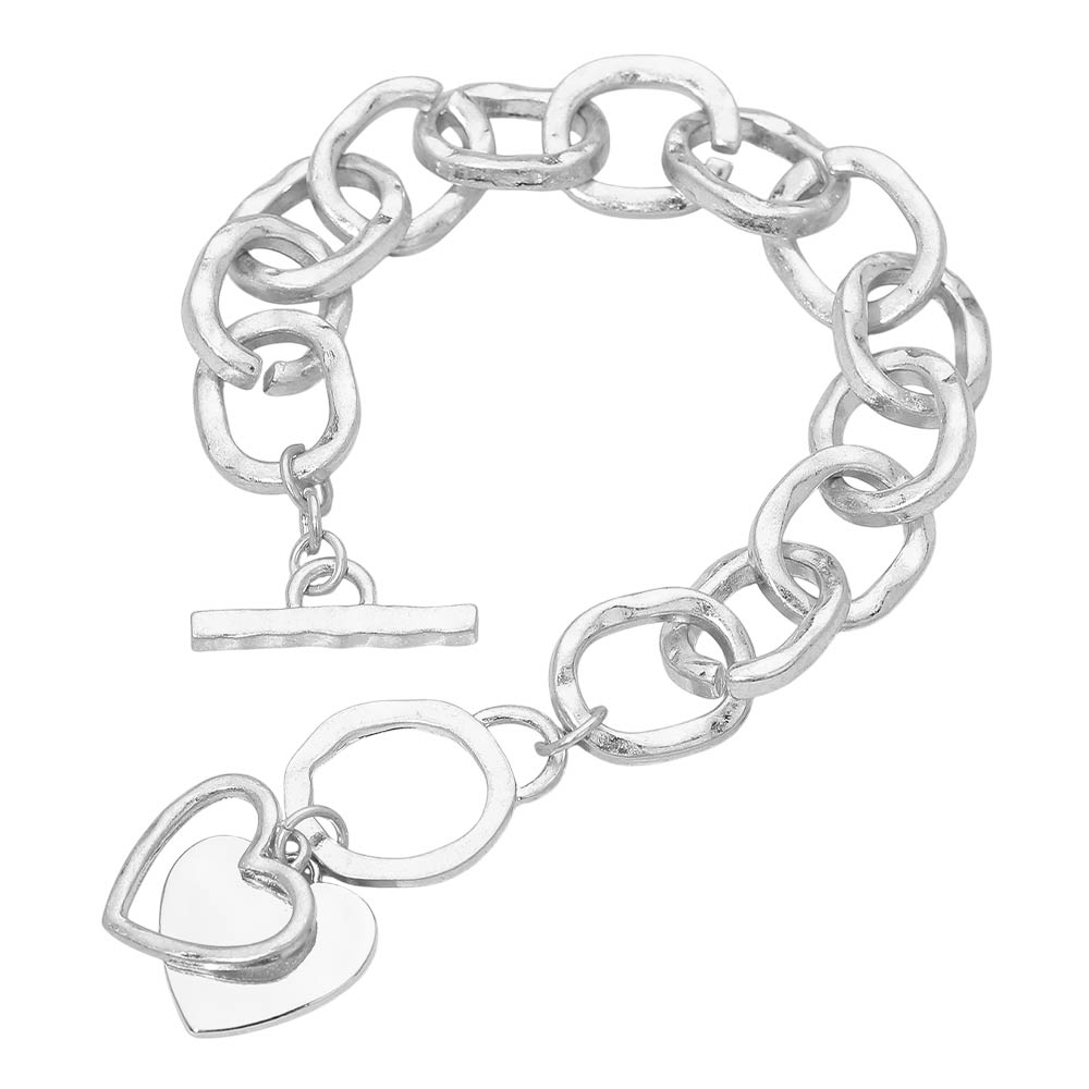 Hammered Layered Heart Charm Chunky Chain Toggle Bracelet Hammered Layered Heart Charm Chunky Chain Toggle Bracelet