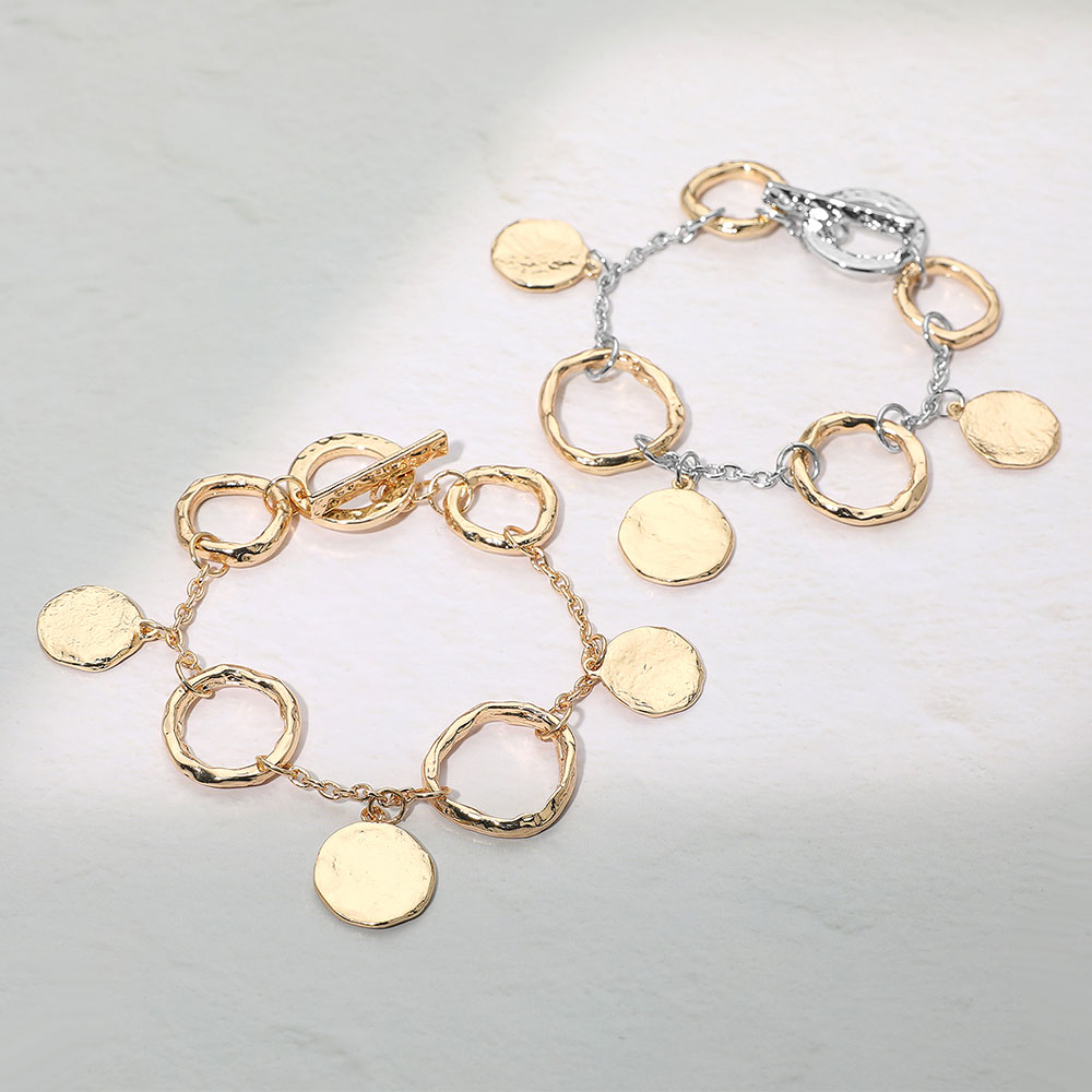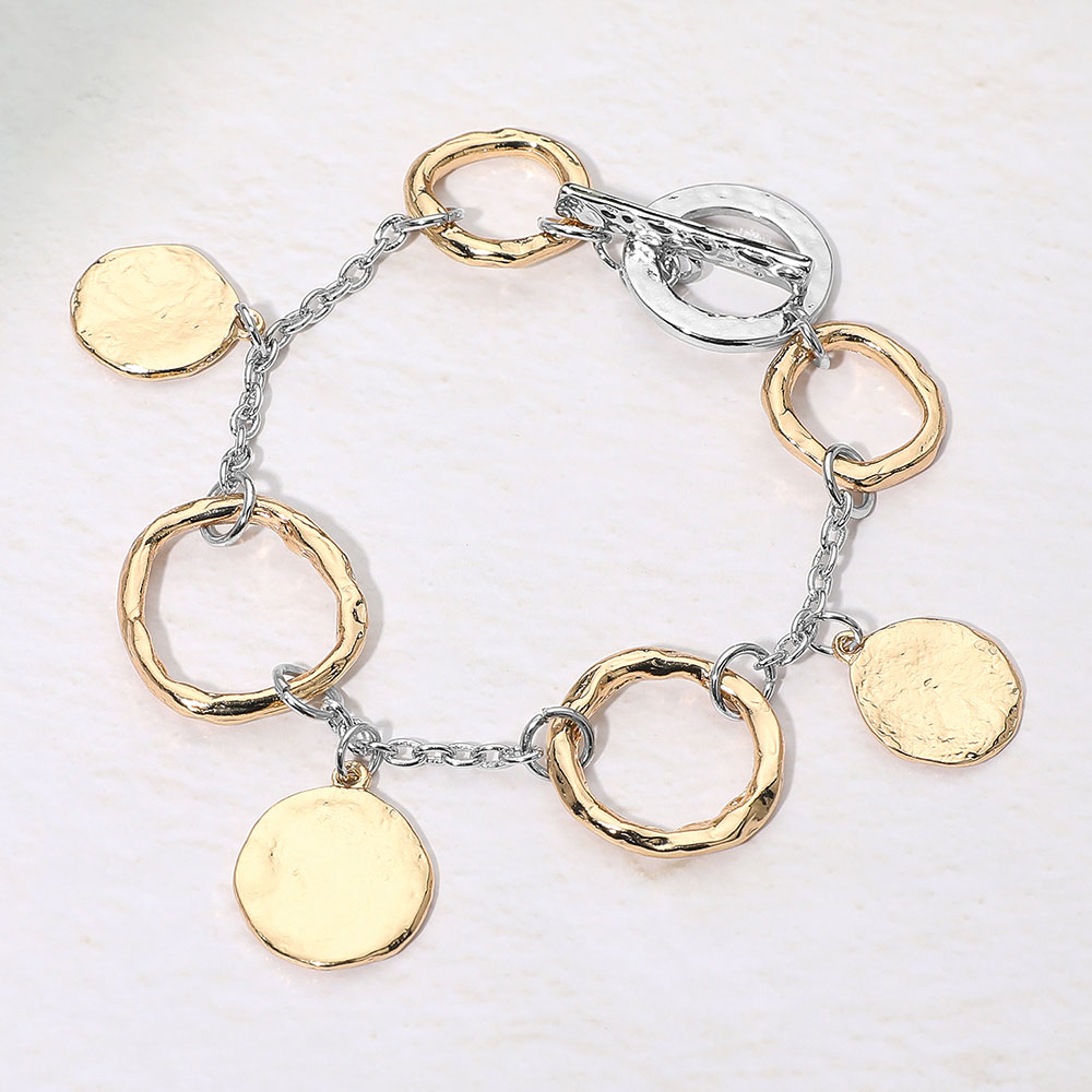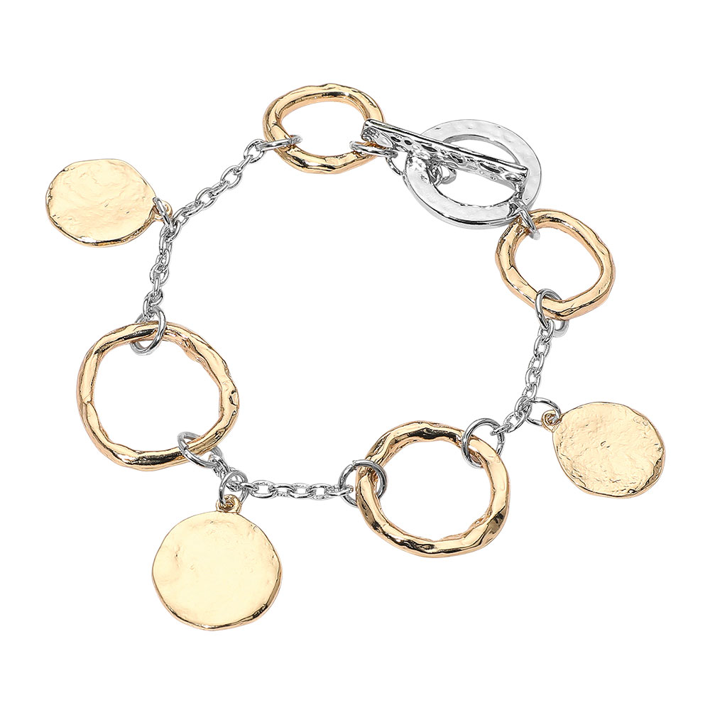 Details • Size : 1" H, 8" L • Toggle Closure • Statement charm bracelet featuring linked circular elements and softly textured drop accents for a modern, eye-catching look. Designed to move with every gesture, it layers easily with other accessories or shines as a bold solo piece. • Lead and Nickel Compliant