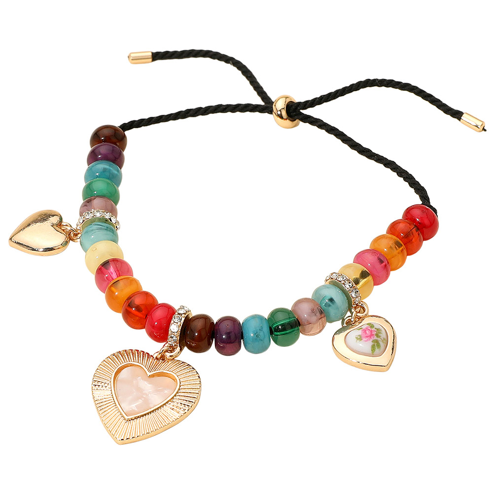 Details • Size : 0.3" H, 11" L • Charm Size : 0.8" X 0.9" • Adjustable • Vibrant adjustable bracelet featuring multicolor beads and gold-tone heart charms for a fun, romantic accent. Designed to add playful elegance to any look, this eye-catching accessory combines bold hues with charming details for a perfect statement of style and personality. • Lead and Nickel Compliant
