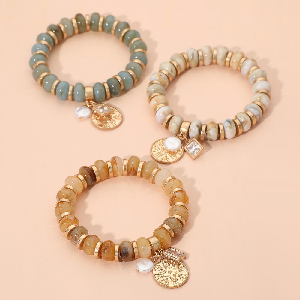 Metal Embossed Medal Square Stone Pearl Charm Rein Disc Beaded Stretch Bracelet