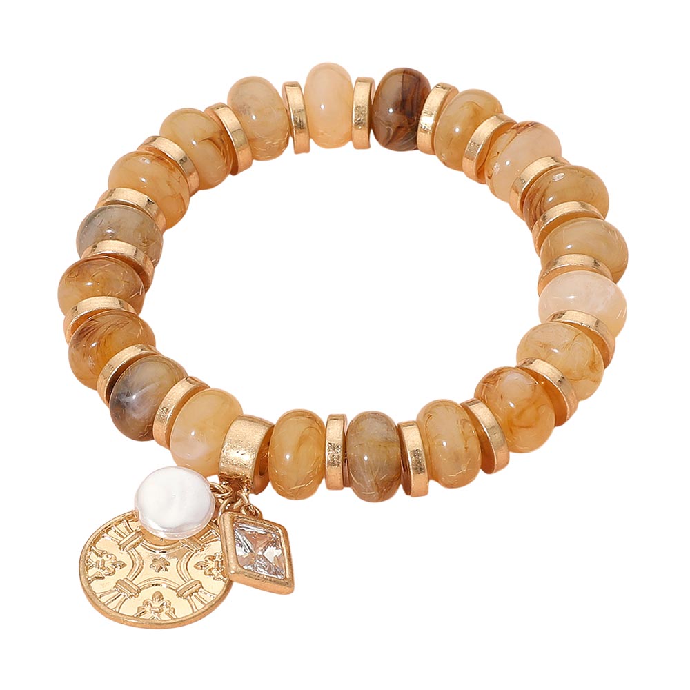 Details • Size : 0.5" H • Charm Size : 0.8" X 0.8" • Stretchable • This beaded stretch bracelet features polished round beads accented with metallic spacers and finished with charming pendants, including a coin, pearl, and crystal detail. Its versatile design makes it a stylish piece for layering or wearing solo for a chic statement. • Lead and Nickel Compliant