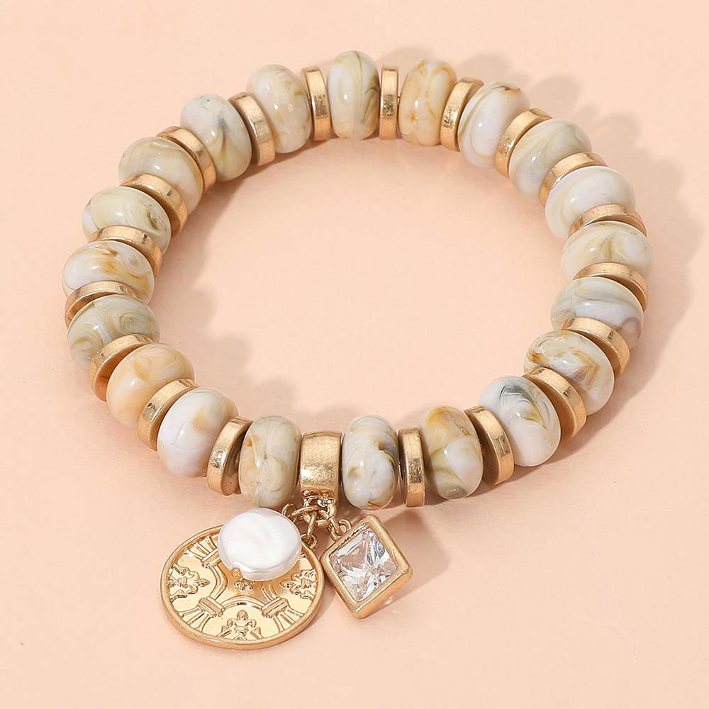 Metal Embossed Medal Square Stone Pearl Charm Rein Disc Beaded Stretch Bracelet