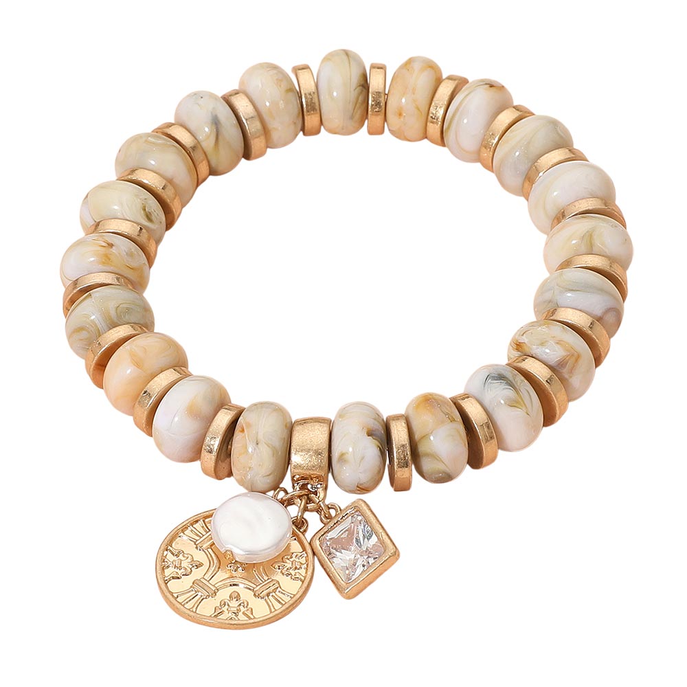 • This beaded stretch bracelet features polished round beads accented with metallic spacers and finished with charming pendants, including a coin, pearl, and crystal detail. Its versatile design makes it a stylish piece for layering or wearing solo for a chic statement.
