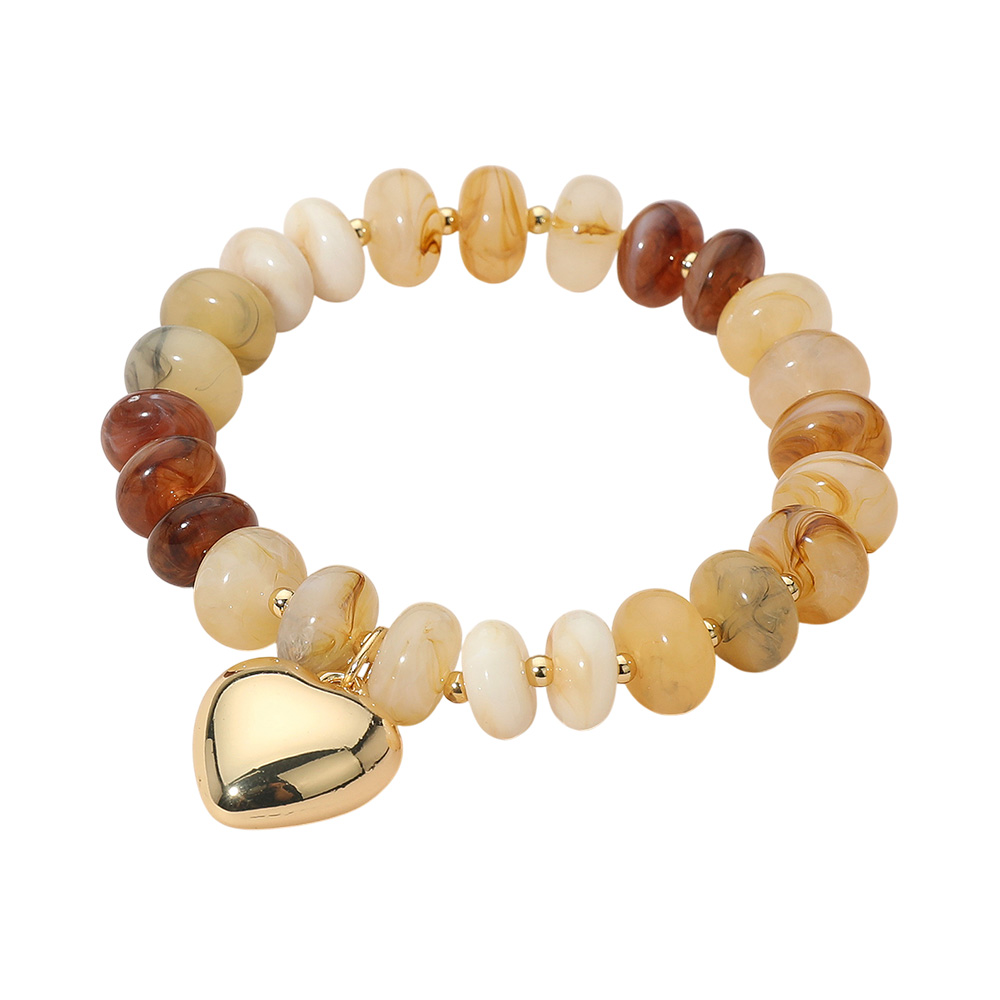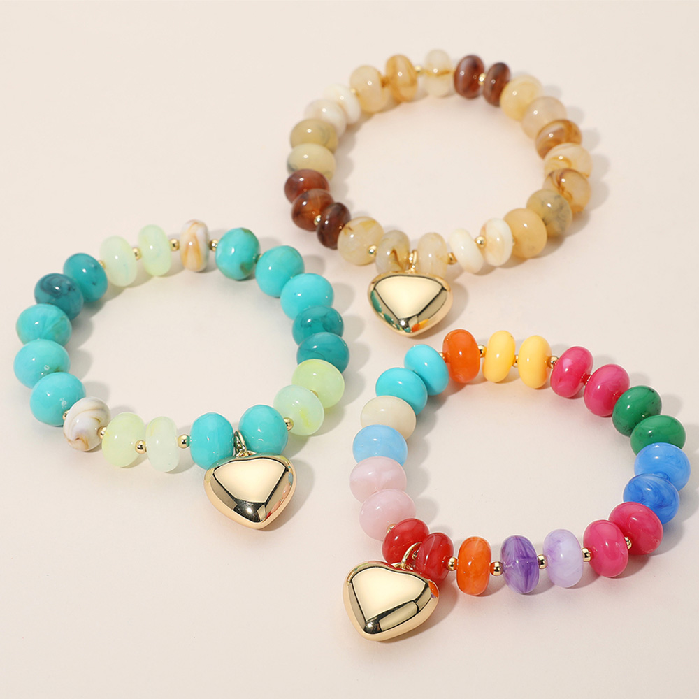 Metal Heart Charm Accent Resin Pebble Beaded Stretch Bracelet