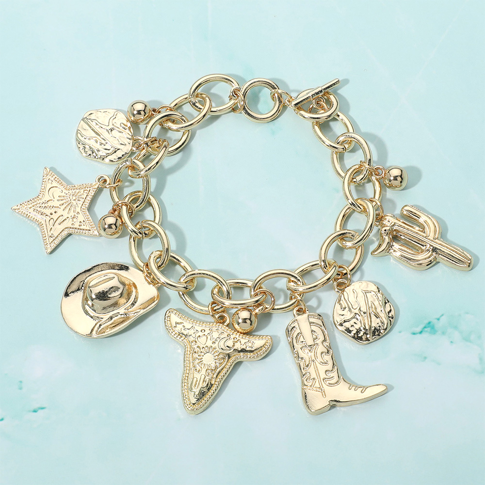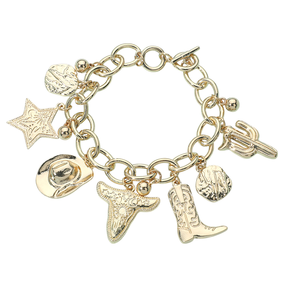 Details • Size : 1.2" H, 6.5" + 1" L • Toggle Closure • Bold Western charm bracelet featuring cowboy hat, boot, cactus, star, and more. A fun statement piece that brings country style to any outfit. Ideal for casual looks or themed occasions. • Lead and Nickel Compliant